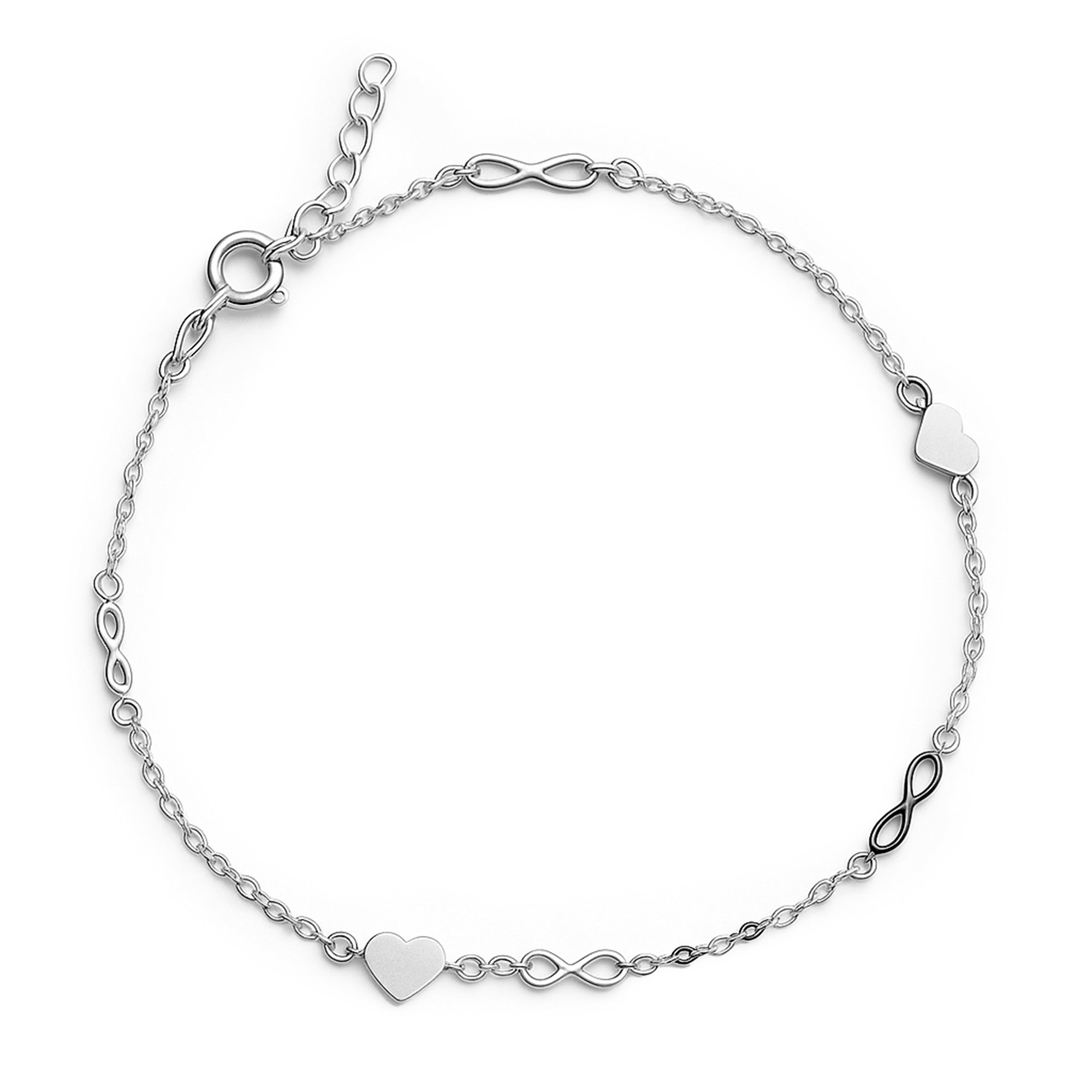 Tobillera Corazón con Infinitos y Cadena de Corazones Plata .925 mas extensión plata .925