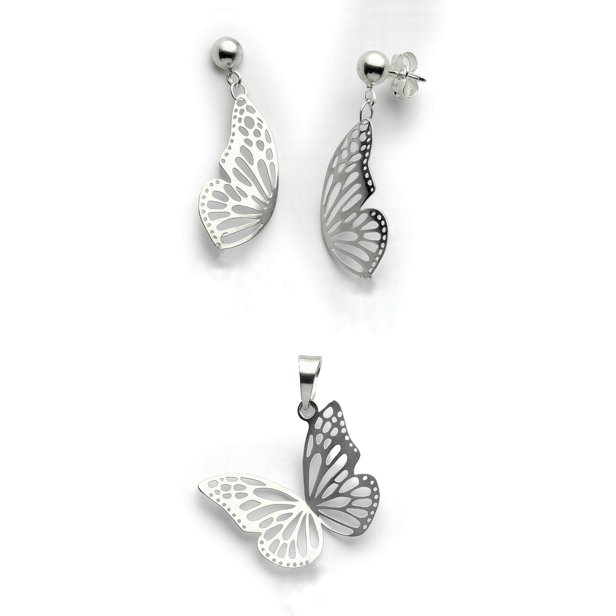 Juego Arete, Dije Mariposa Grande Calada Lisa Plata .925