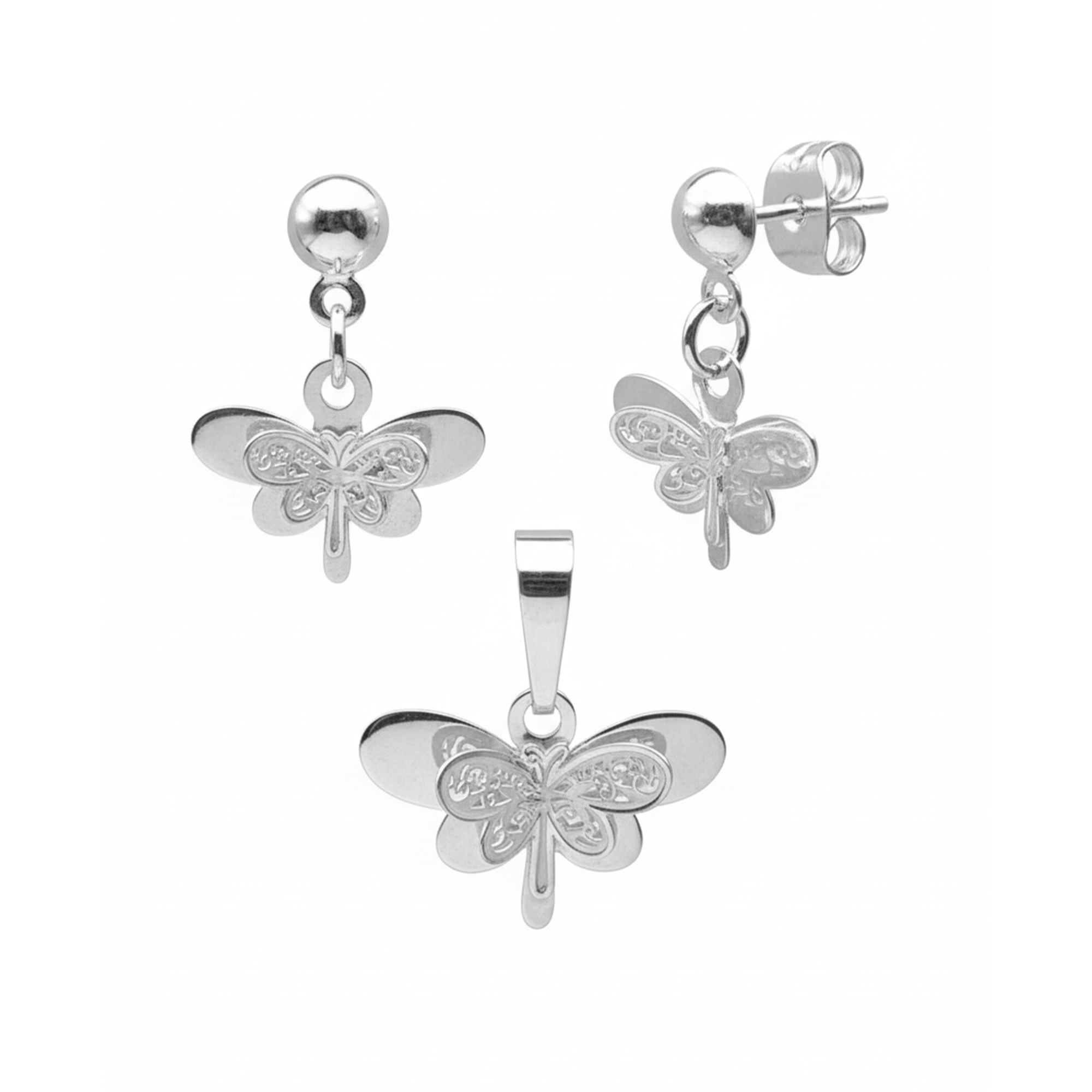 Juego Arete, Dije Libelula Doble con Grecas y Lisa Plata .925