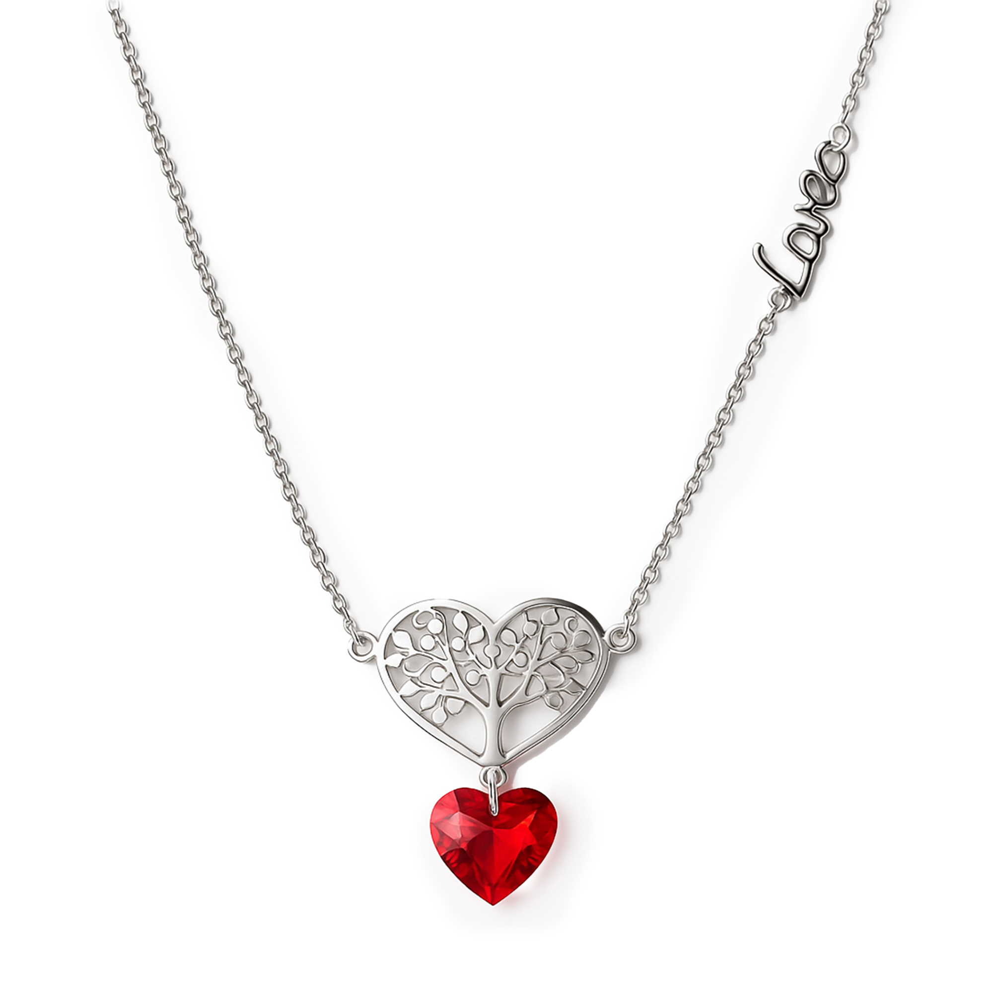 Collar Corazon con Árbol de la Vida y Swarovski Rojo en Forma de Corazón Plata .925
