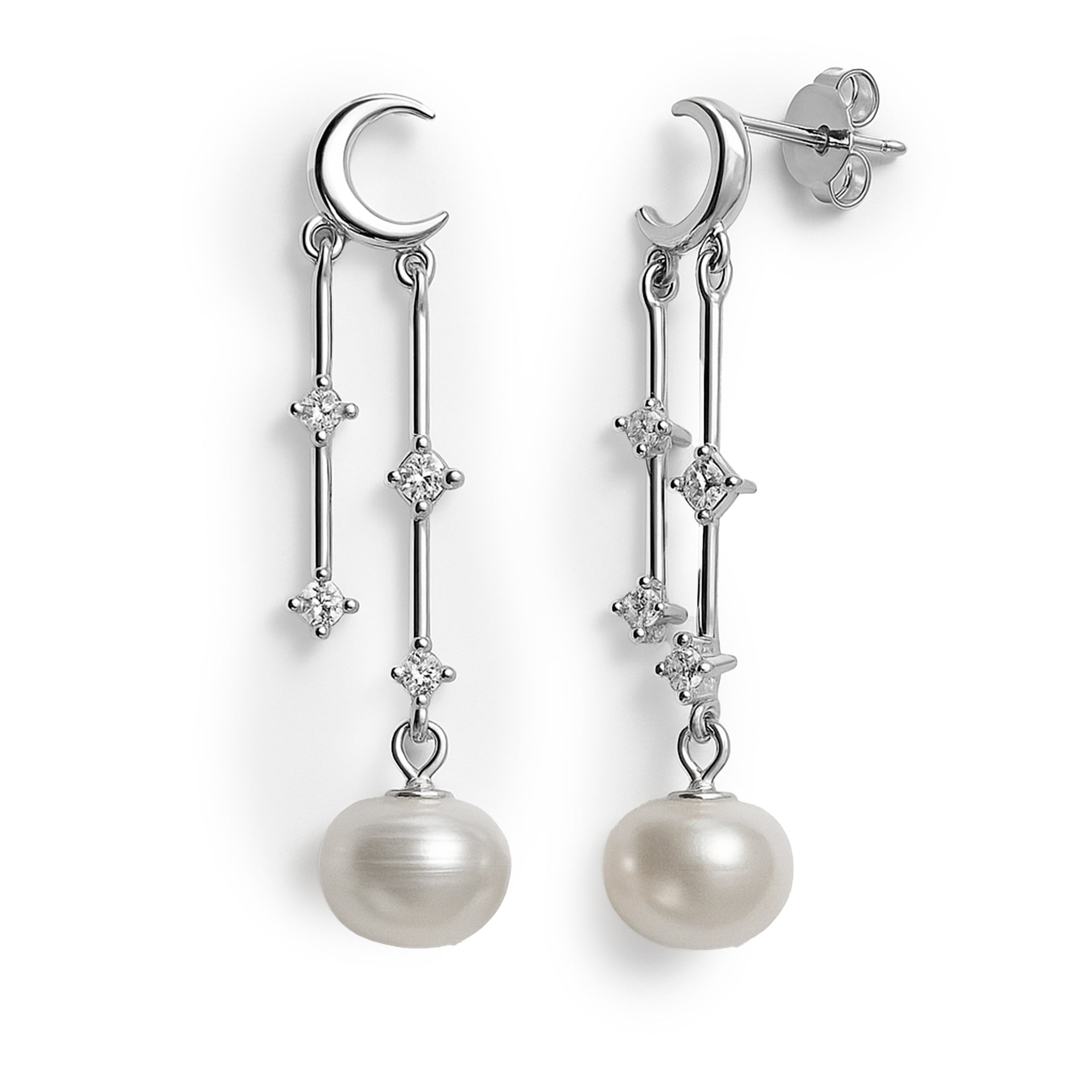 Arete Largo Perla con Luna y Circonias Plata .925Descargar Imagen