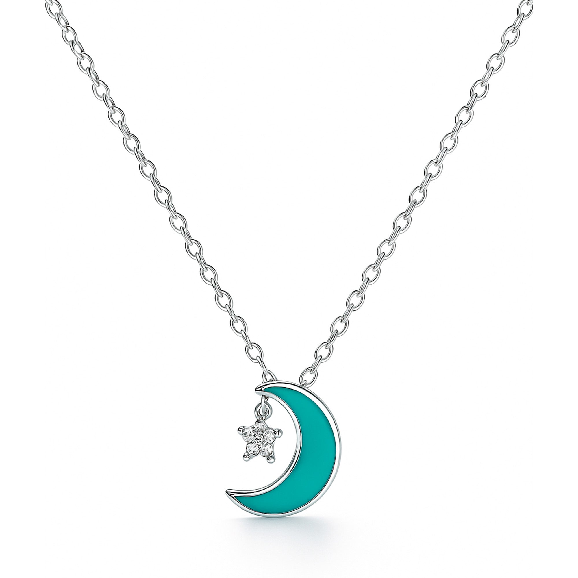 Collar Luna Esmaltada con Circonia y Cadena Eslabones Plata .925 con Rodio mas Extensión