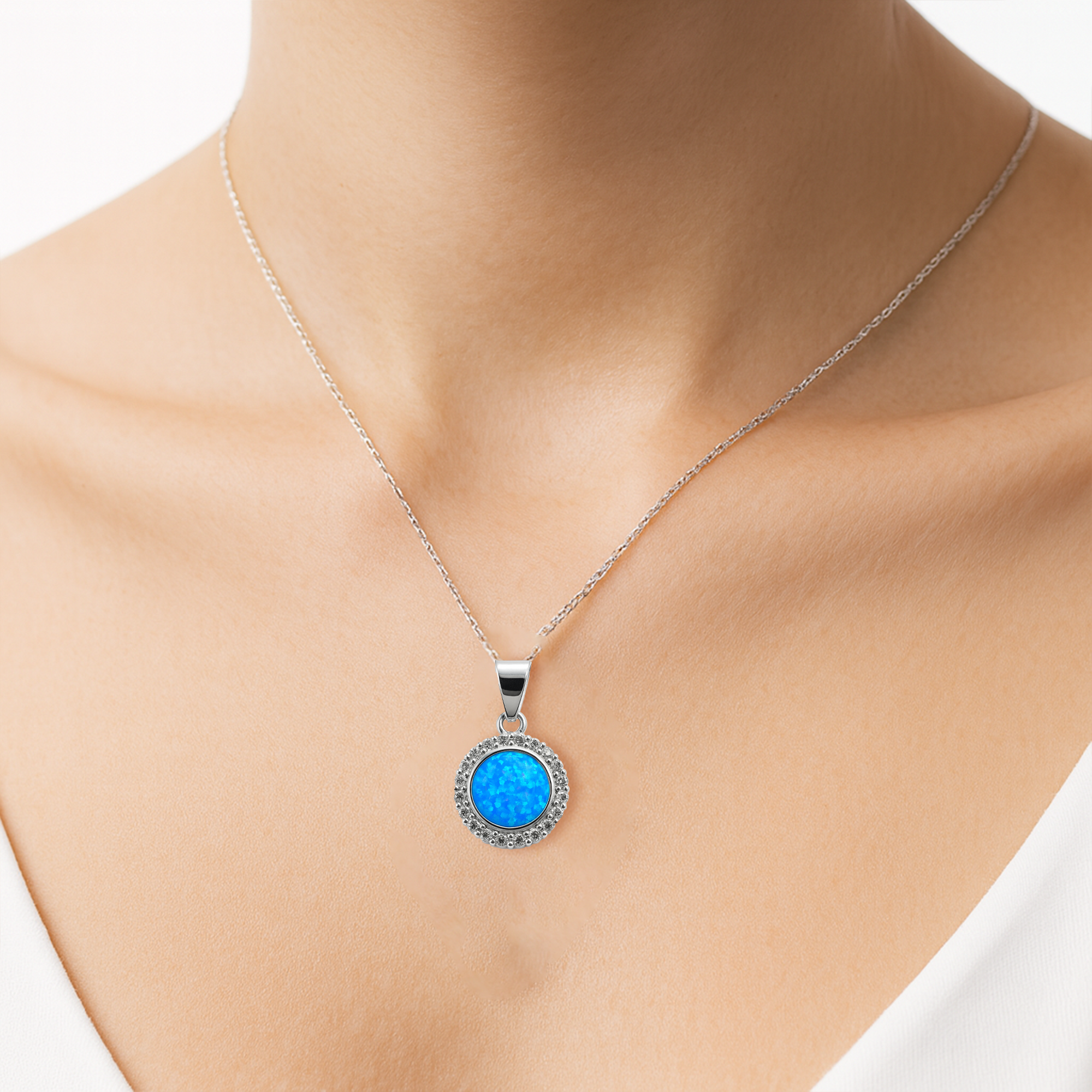 Dije Redondo de Ópalo con Micro Circonias de 1.5cm Plata .925 Disponible en: Azul, Blanco y Rosa