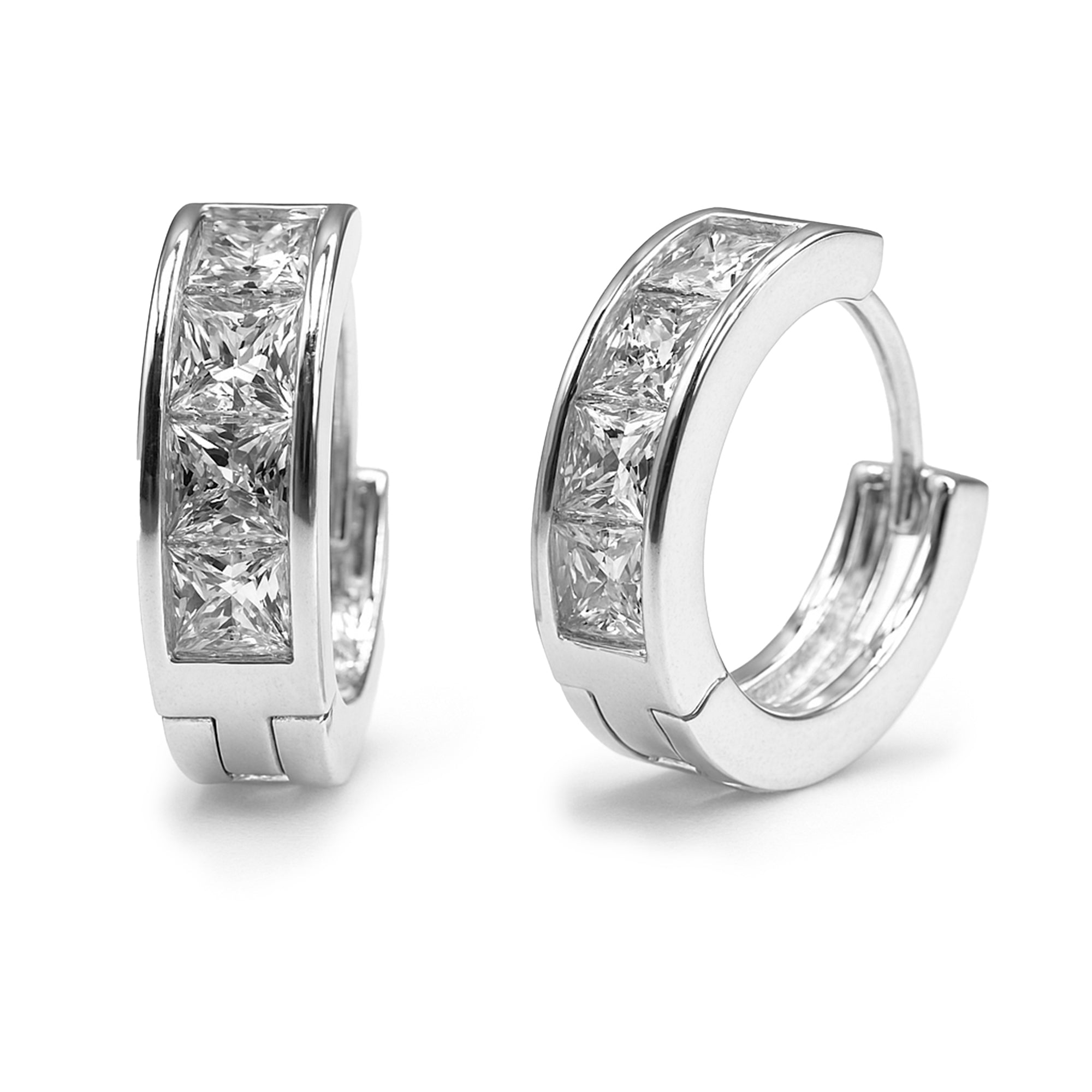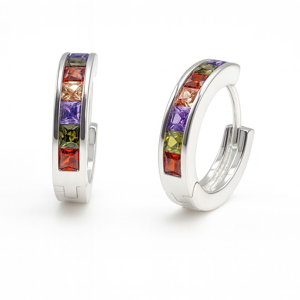 Huggies Linea de Circonias Plata .925 con Rodio, disponible en blanco y multicolor. Tamaño: 1.2 cm