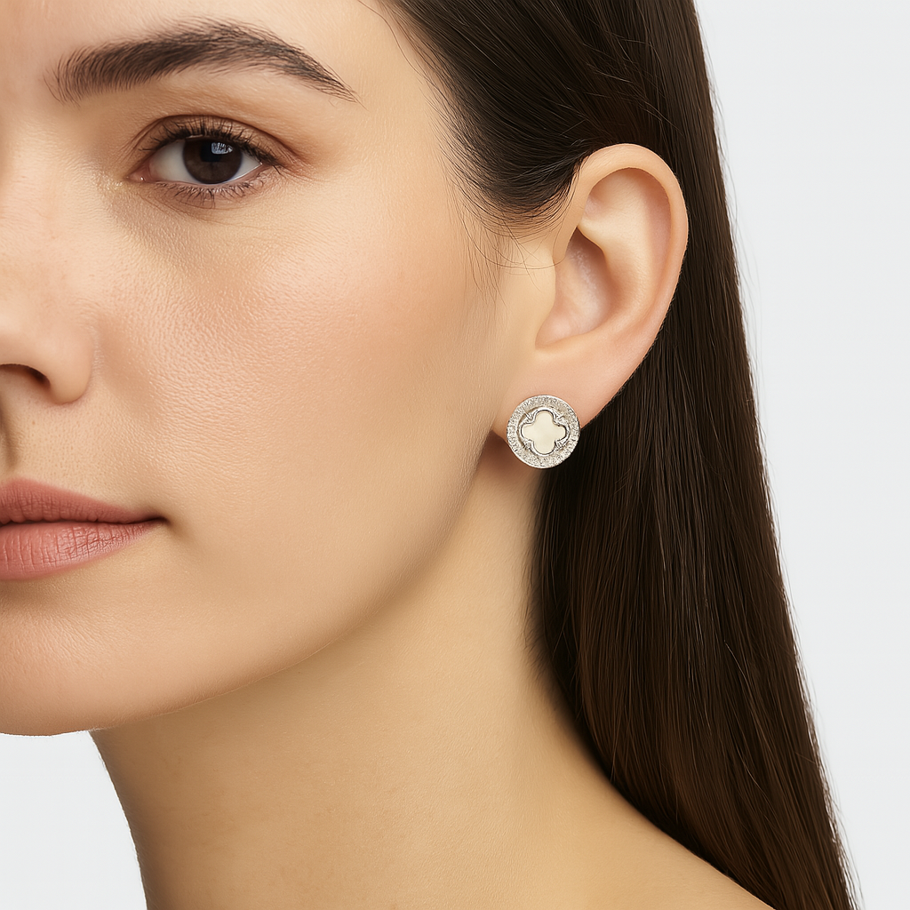 Huggies Flor Inspirado Van C Madre Perla con Micro Circonias en Circulo Plata .925 con Rodio