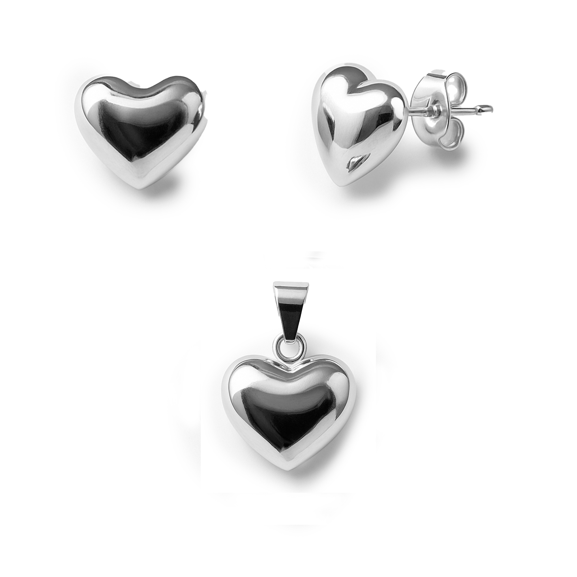 Juego Arete, Dije Corazón Bombeado Chico Plata .925