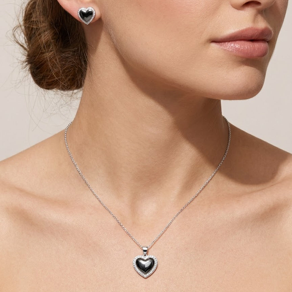 Juego Arete, Dije Corazón Bombeado con Micro Circonias Alrededor Plata .925 con Rodio