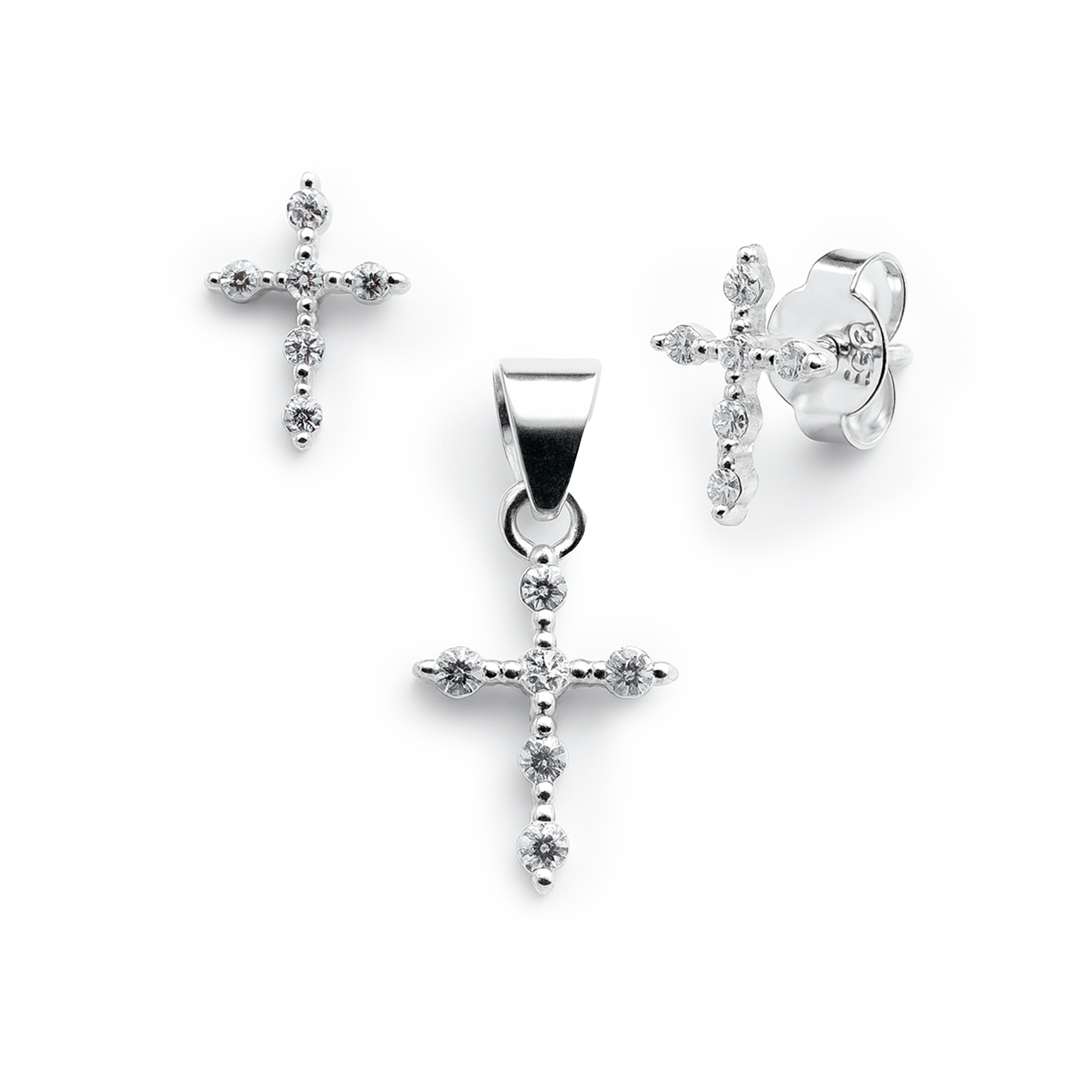 Juego Arete, Dije de Cruz Chica con Circonias Plata .925