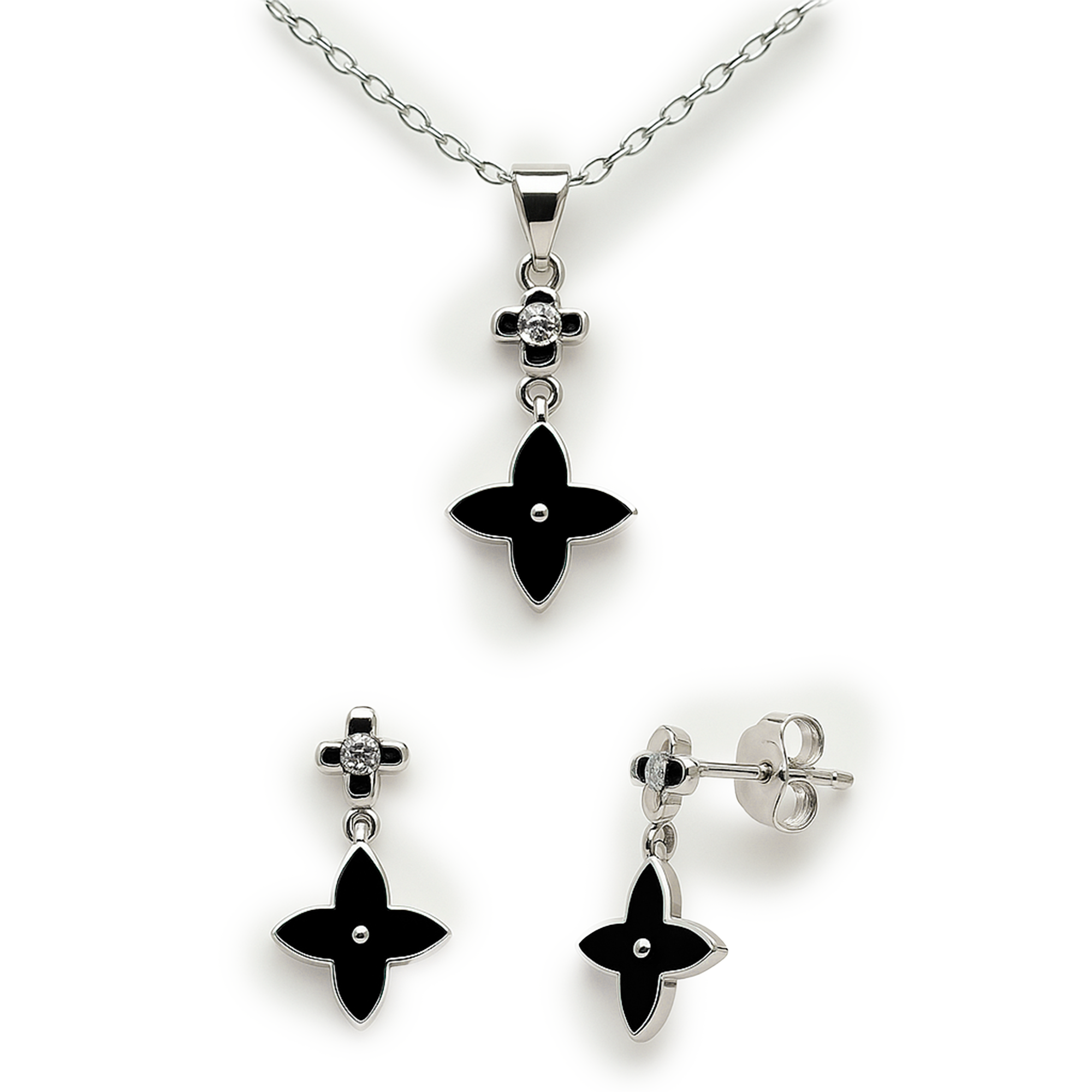 Juego Arete, Collar Inspirado LV Piedras Naturales Plata .925 con Rodio Disponible en: Negro Onix, Verde Malaquita, Madre Perla y Agata Comprimida