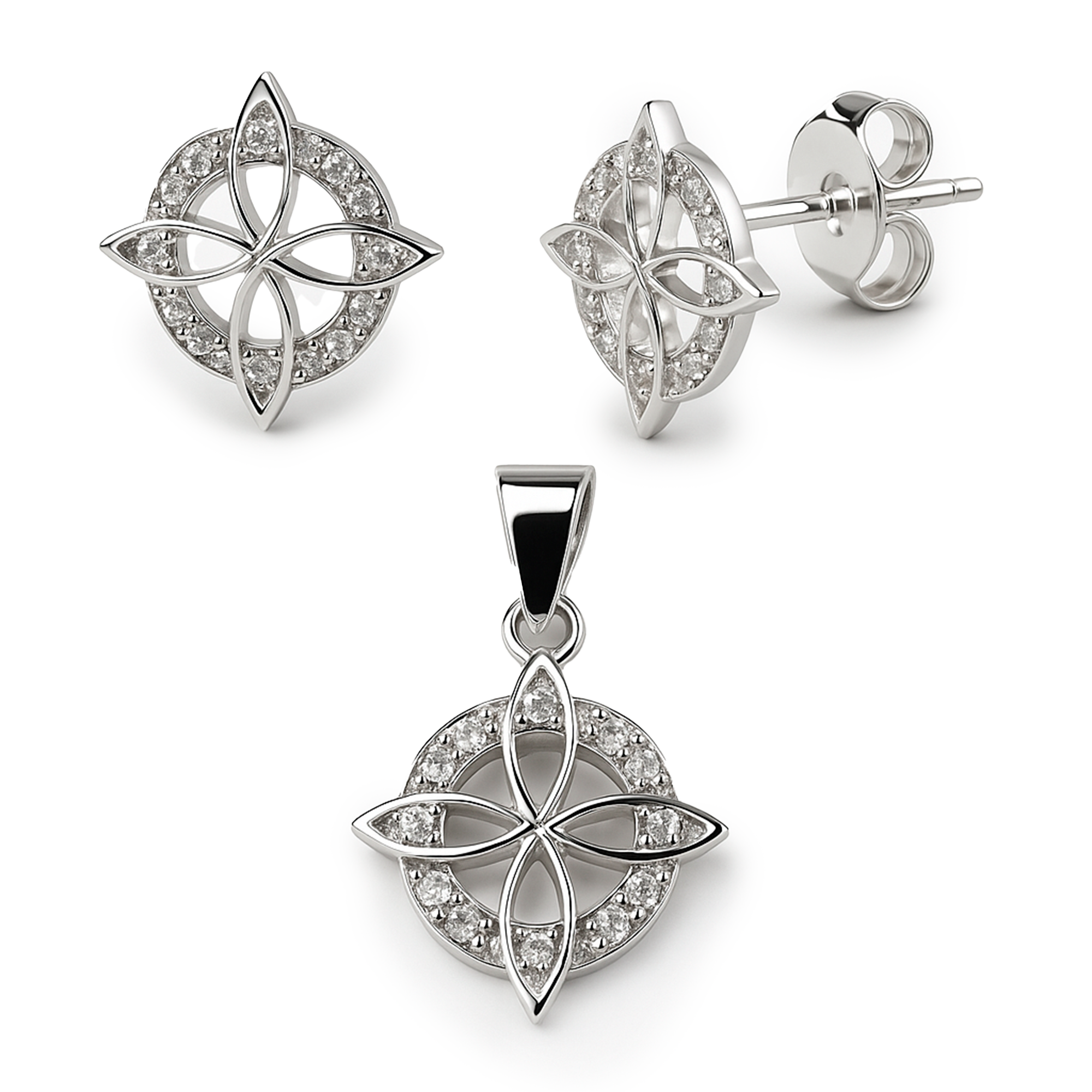 Juego Arete, Dije Nudo de Bruja con Circonias Plata .925