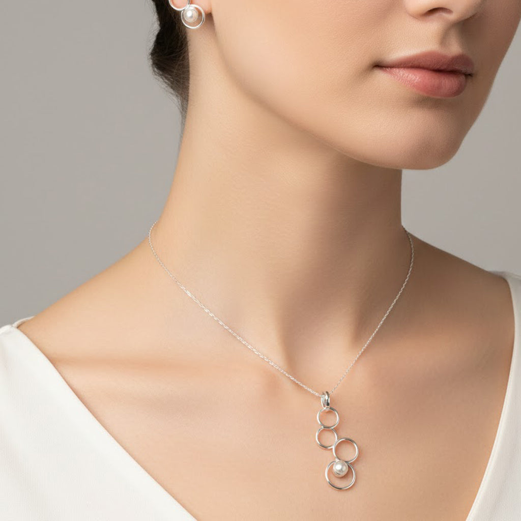 Juego Arete, Dije Perla Natural con Siluetas de Círculos Plata .925