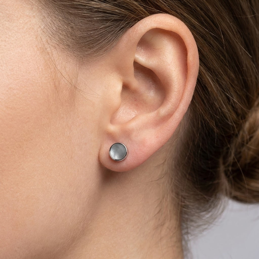 Broquel Redondo Madre Perla Blanca Plata .925 con Rodio