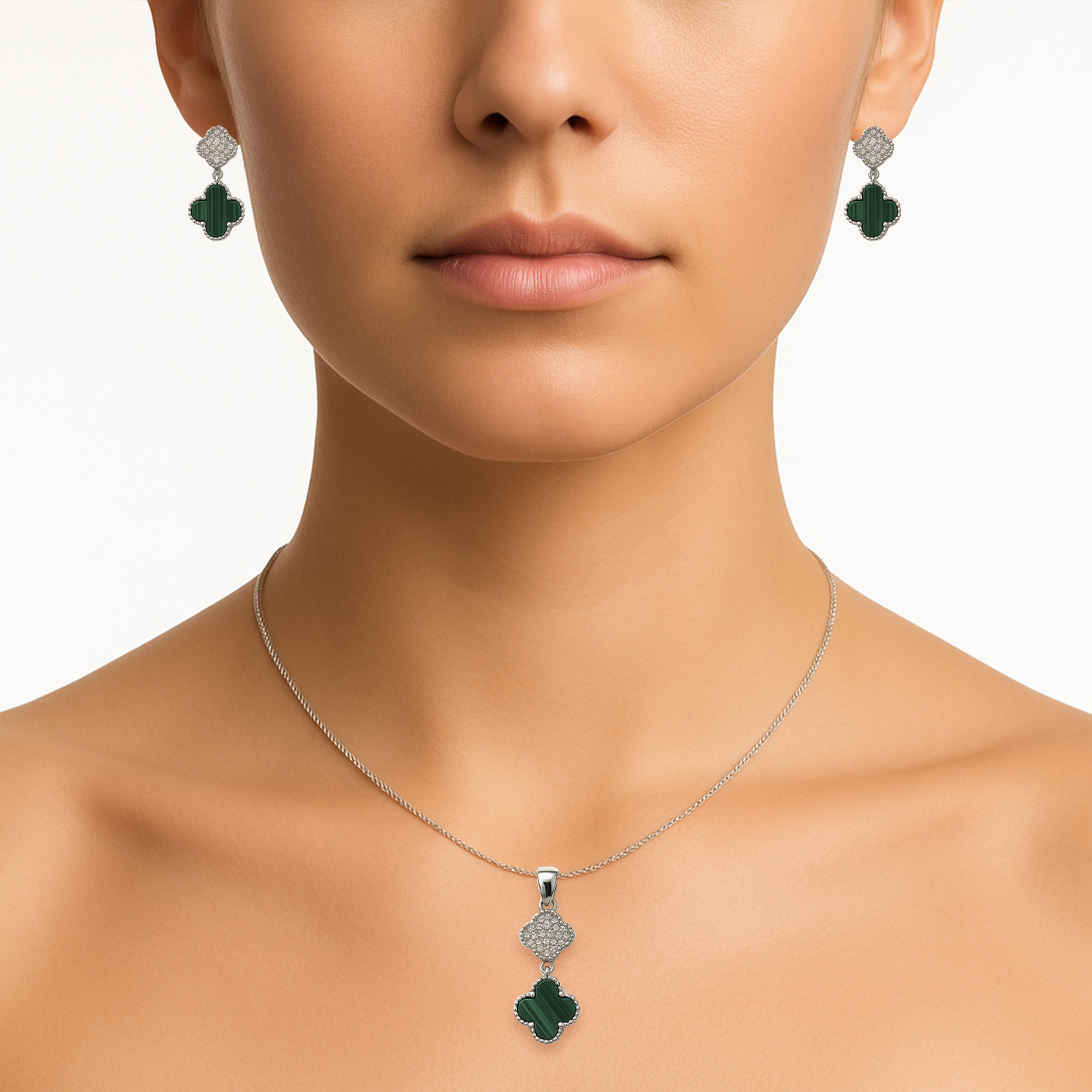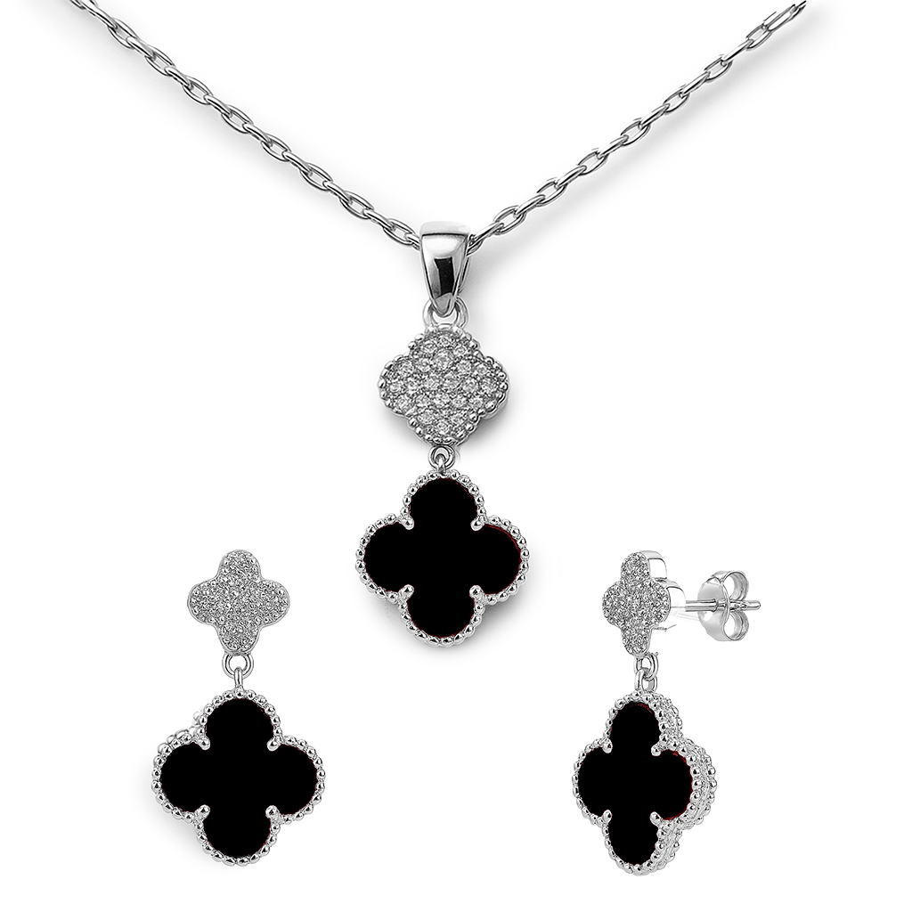 Juego Flor Chica Arete, Collar Inspirado Van Cleef Piedras Naturales con Micro Circonias Plata .925 con Rodio Disponible en: Negro Onix, Verde Malaquita, Madre Perla y Agata Comprimida