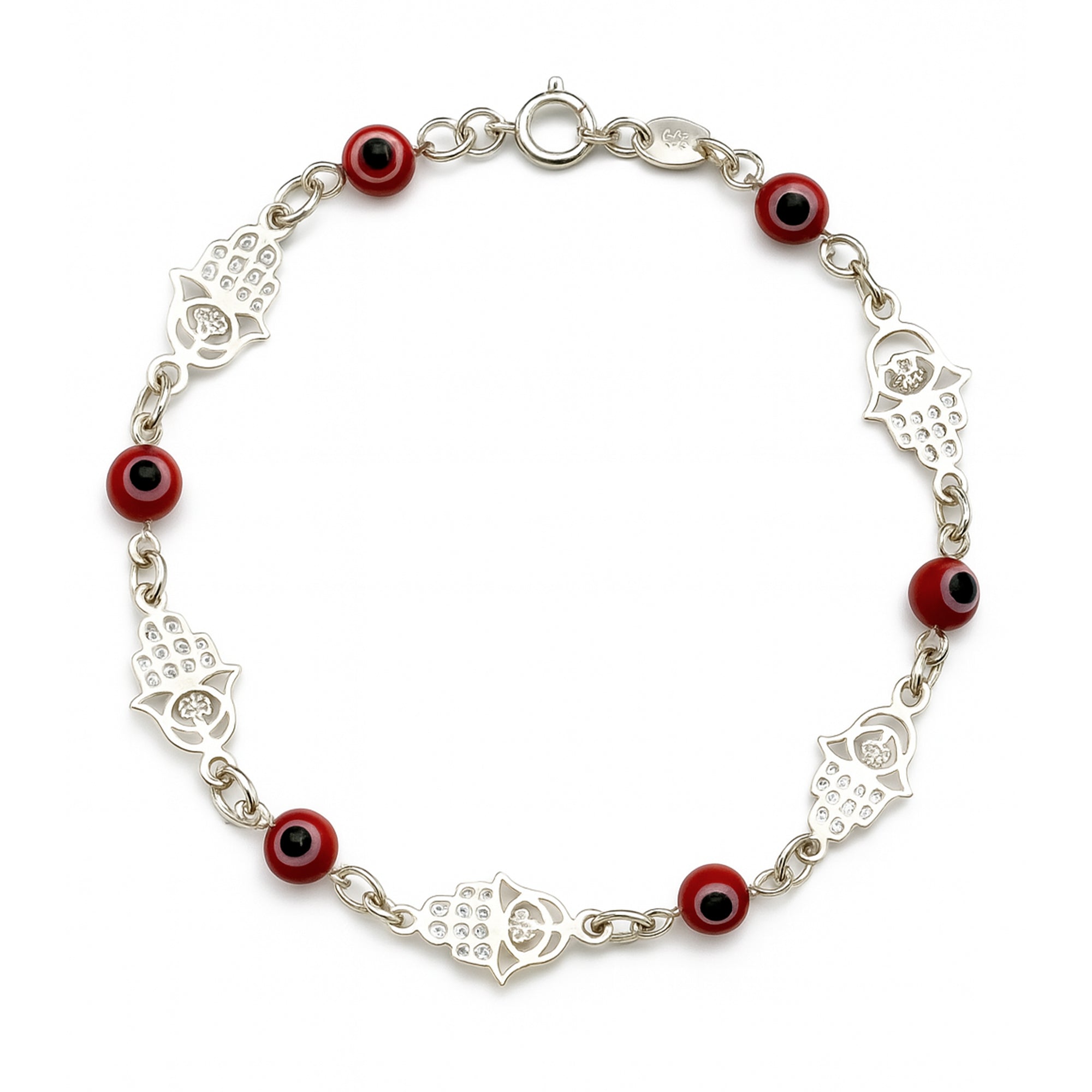 Pulsera Ojo Turco Rojo con Mano de Fatima Plata .925