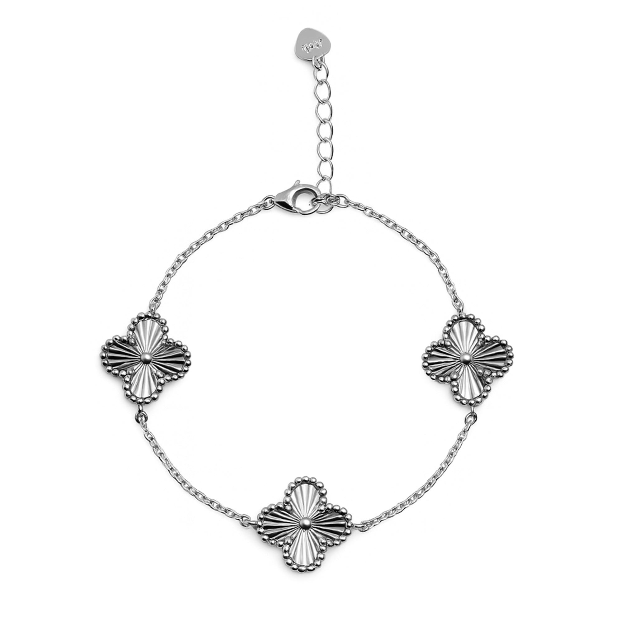 Pulsera inspirada van cleef 3 flores diamantadas con boton y rodio mas extensión plata .925