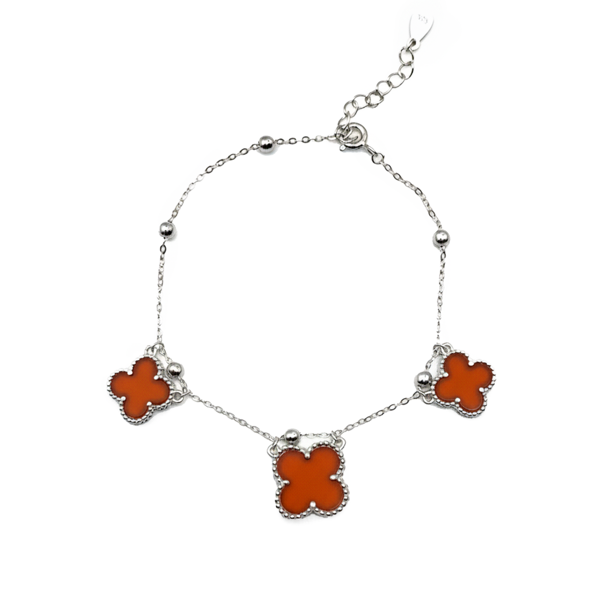 Pulsera inspirada van cleef flor dos tamaños en diferentes piedras: cornalina naranja y malaquita verde con bolitas con rodio mas extensión plata .925
