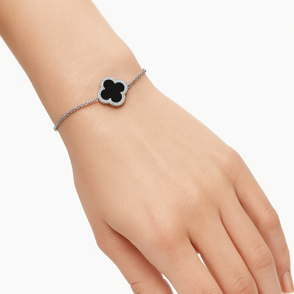 Pulsera inspirada van cleef flor negra onix o madre perla con silueta de micro circonias blancas y rodio mas extensión plata .925