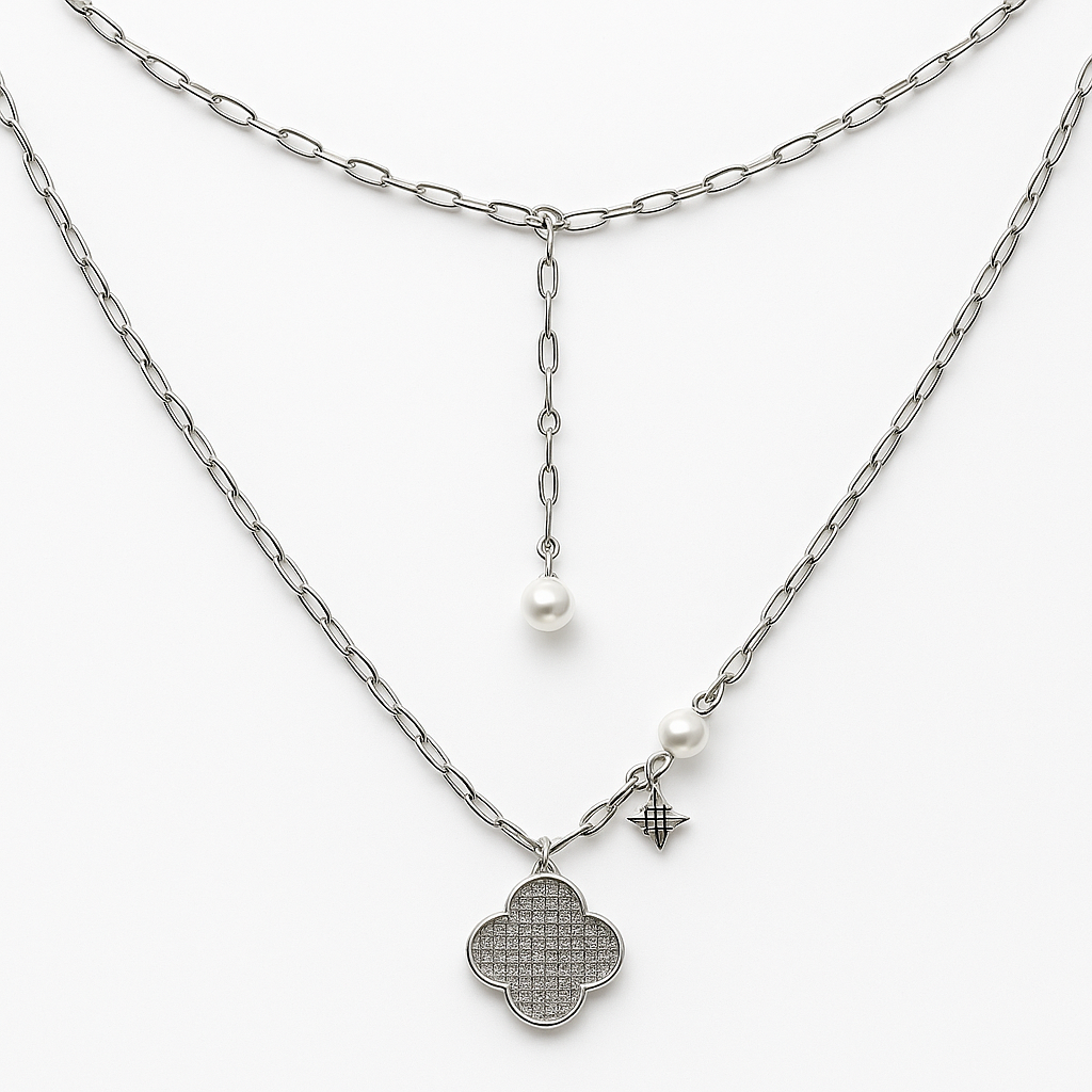 Collar Flor Inspirado Van C con Micro Circonias y Perla Natural Plata .925 con Rodio