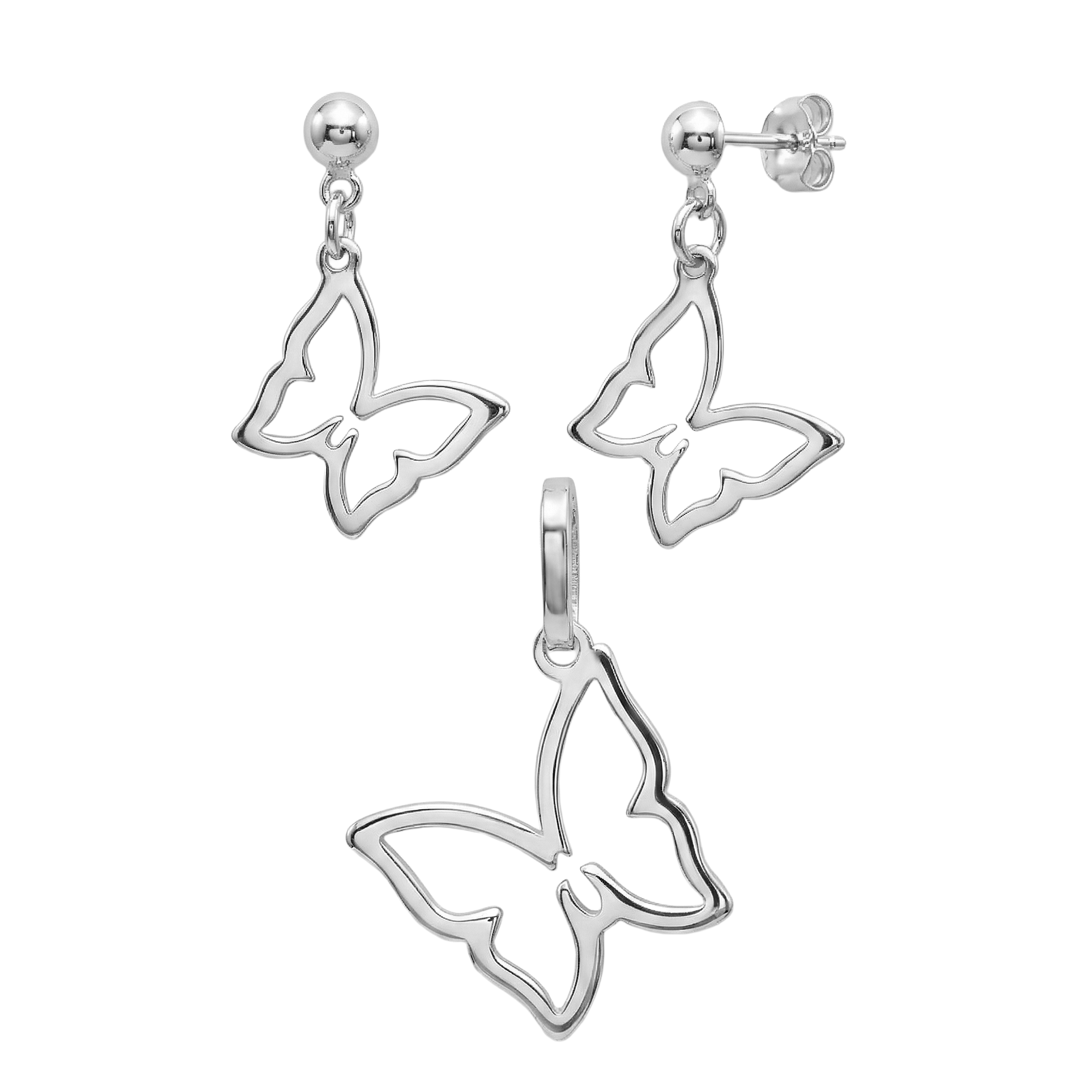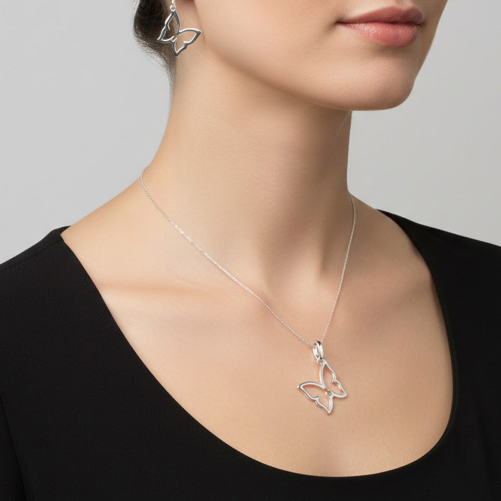 Juego Arete, Dije Silueta de Mariposa Lisa Plata .925