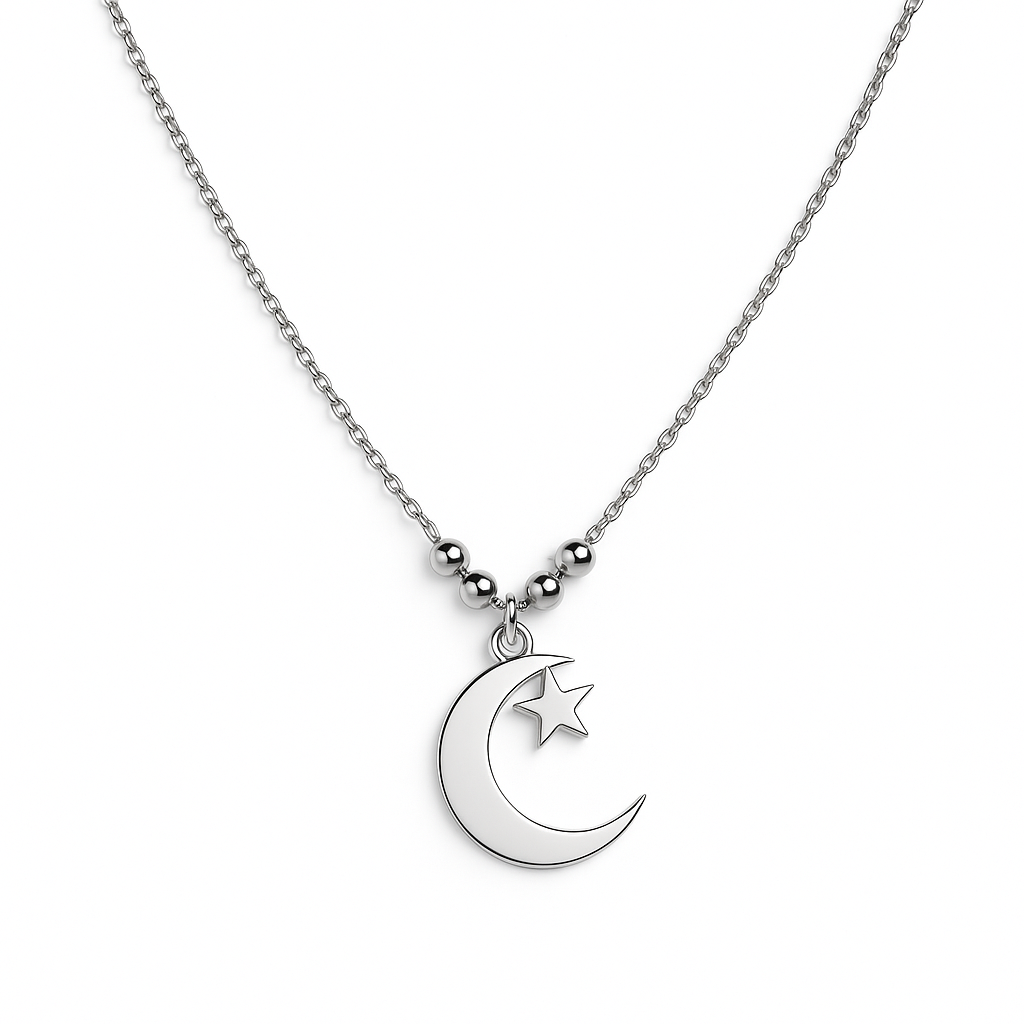 Collar Media Luna y Estrella Lisas con Bolitas Diamantadas y Cadena Eslabones Plata .925 mas Extensión