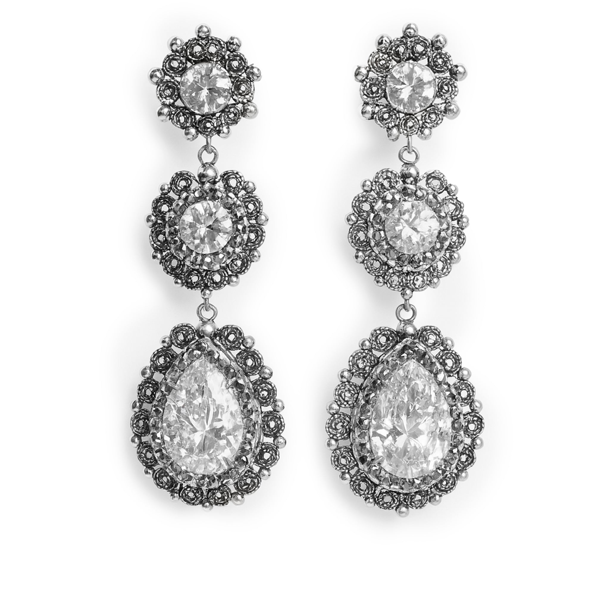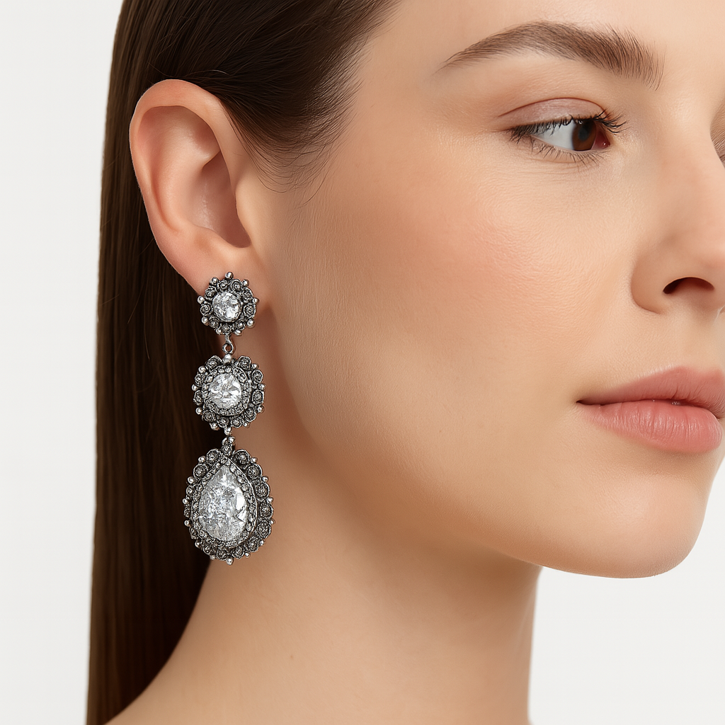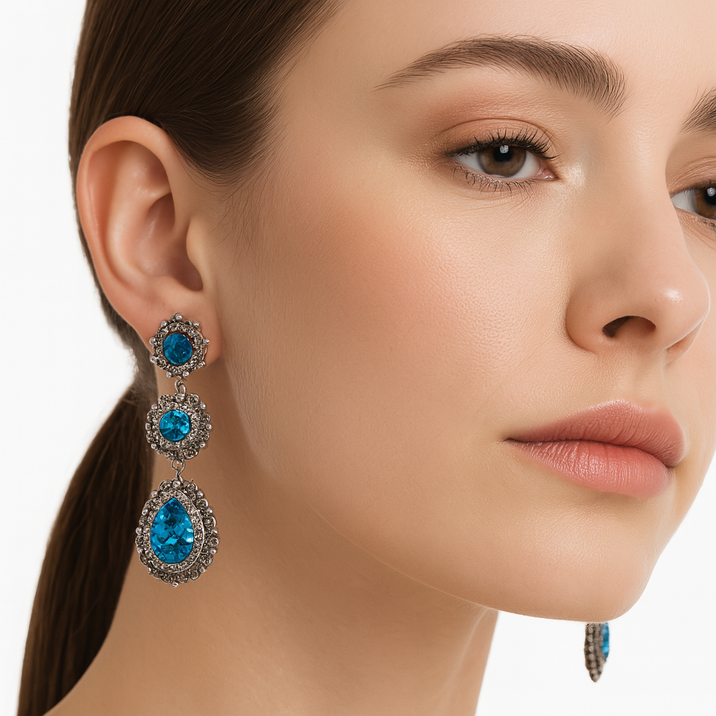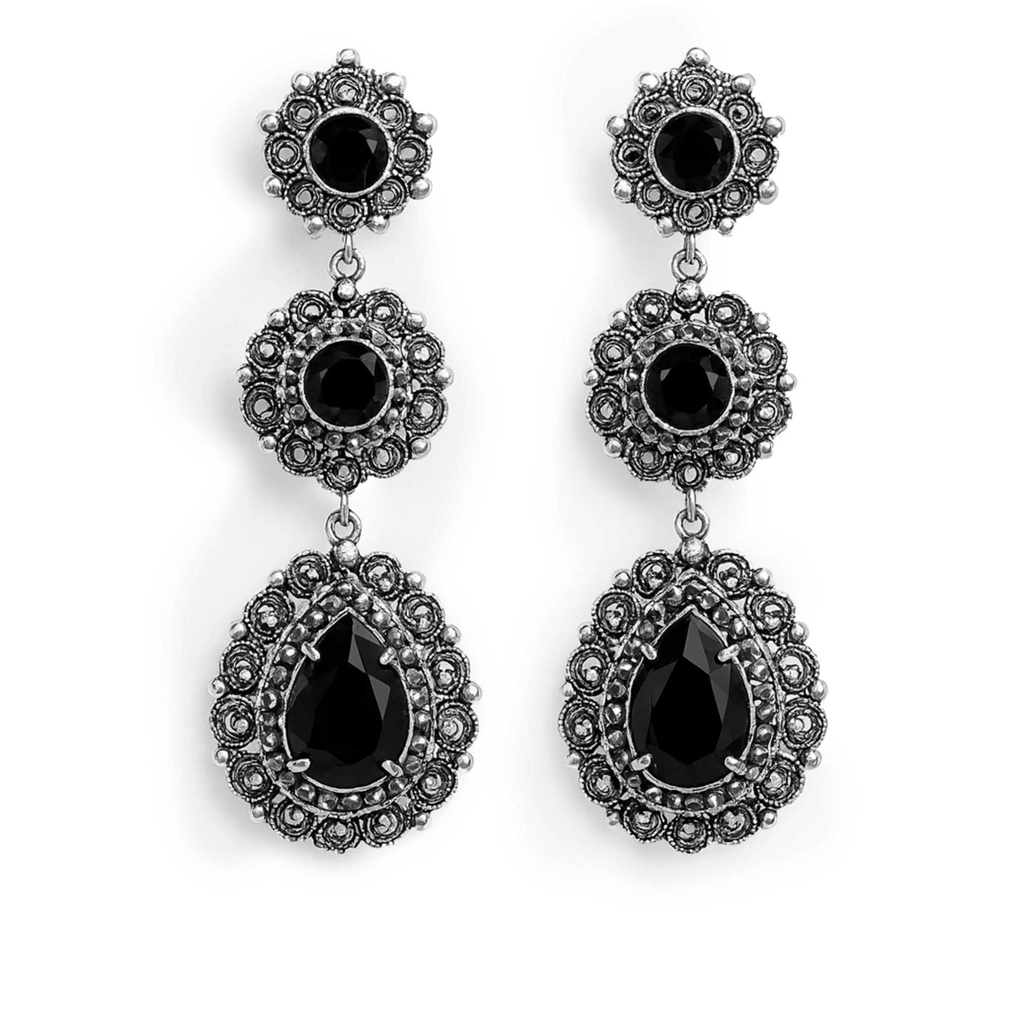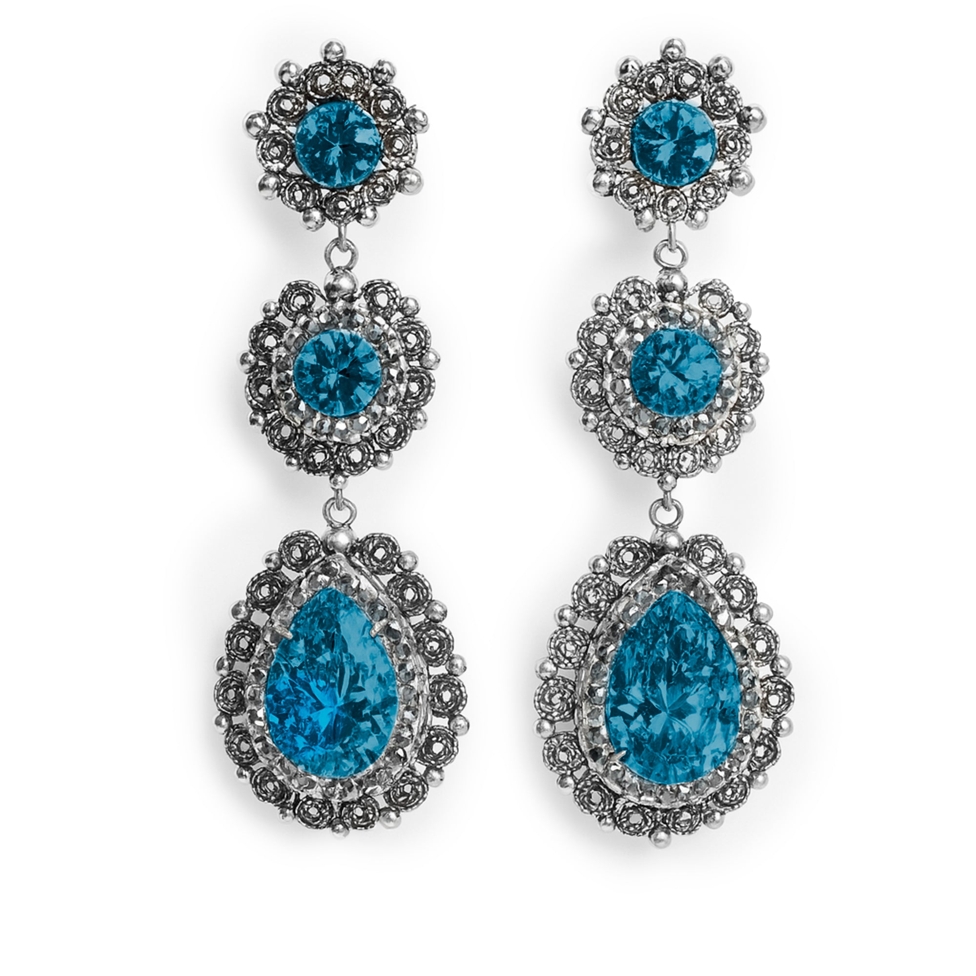 Arete Largo Filigrana Triple con Circonias y Hematite Hecho a Mano Plata .925, disponible en negro, blanco y azul. La elaboración de este producto le lleva un día entero al artesano