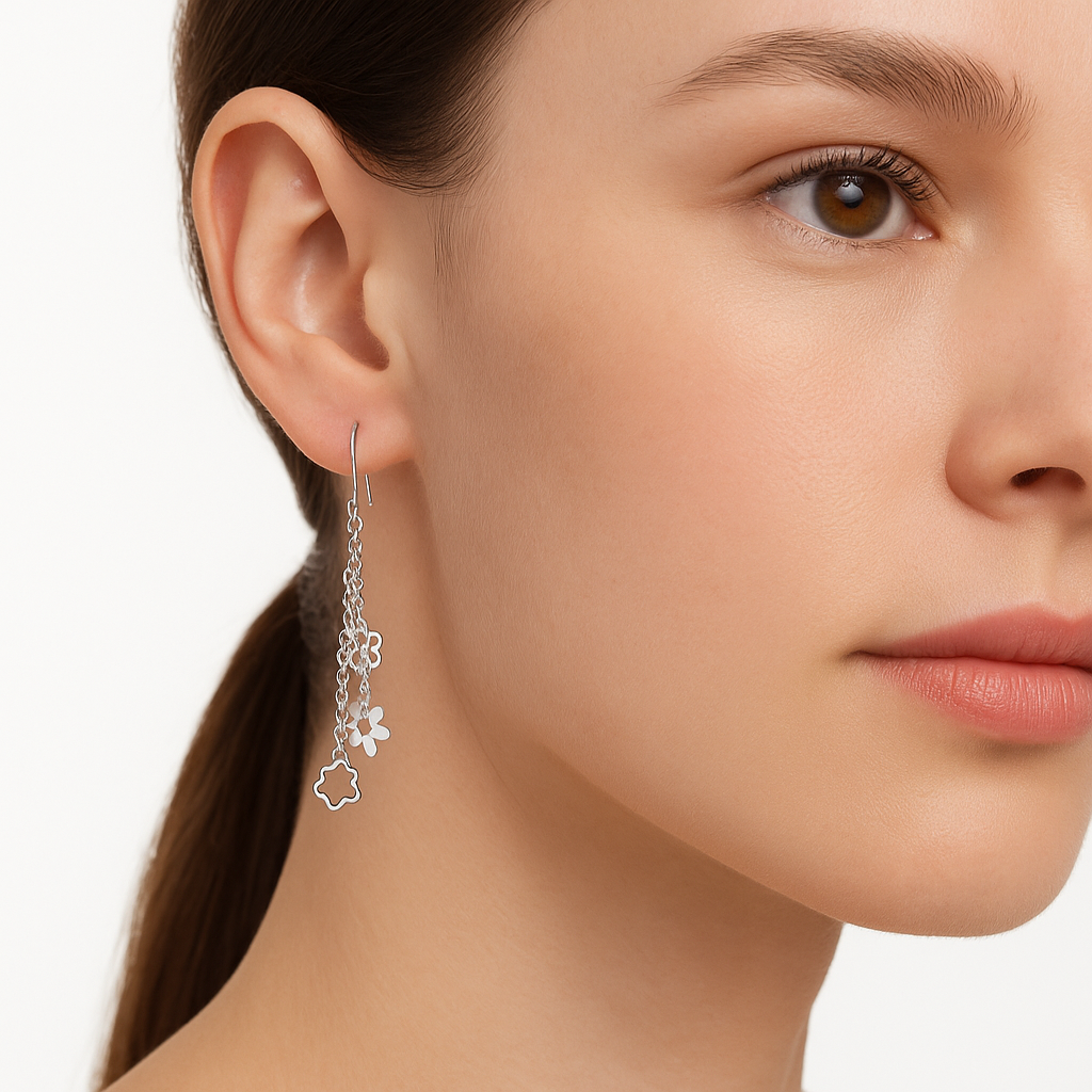 Arete Largo 3 Flores Lisas con Cadena Eslabones Hecho a Mano Plata .925. Medida: 7.5 cm