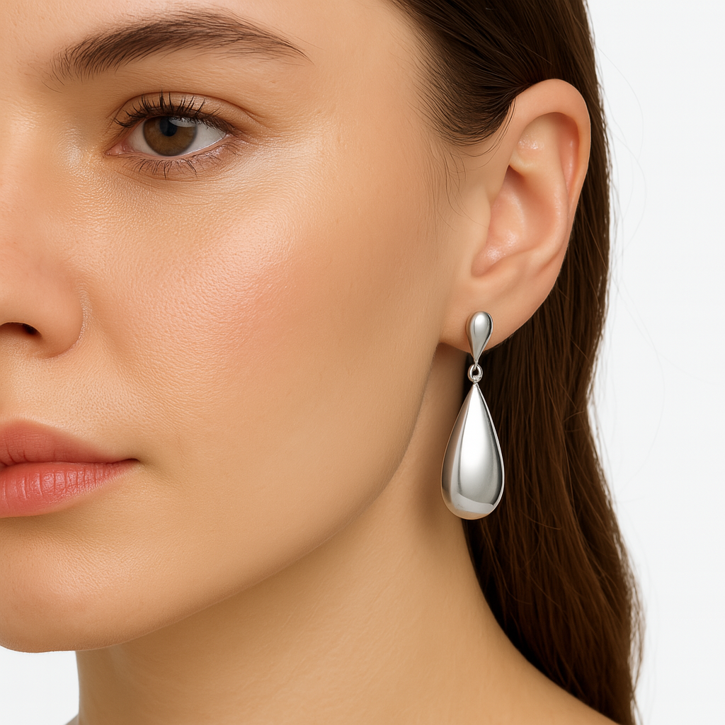 Arete Mediano Gota Bombeada Lisa Hecha a Mano Plata .925. Medida: 3.5 cmDescargar Imagen