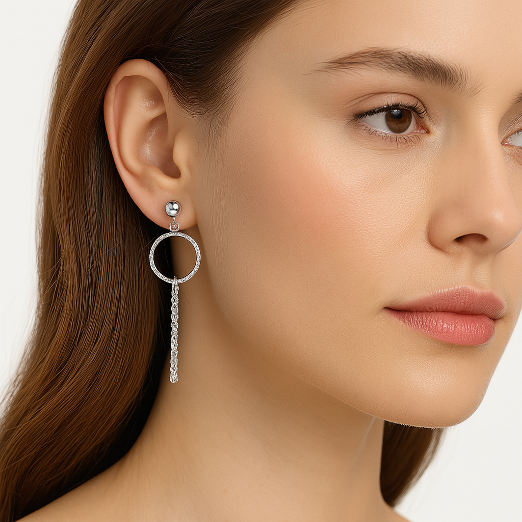 Arete Largo con Aro Martillado y Cadena Eslabones Hecho a Mano Plata .925. Medida: 7 cm
