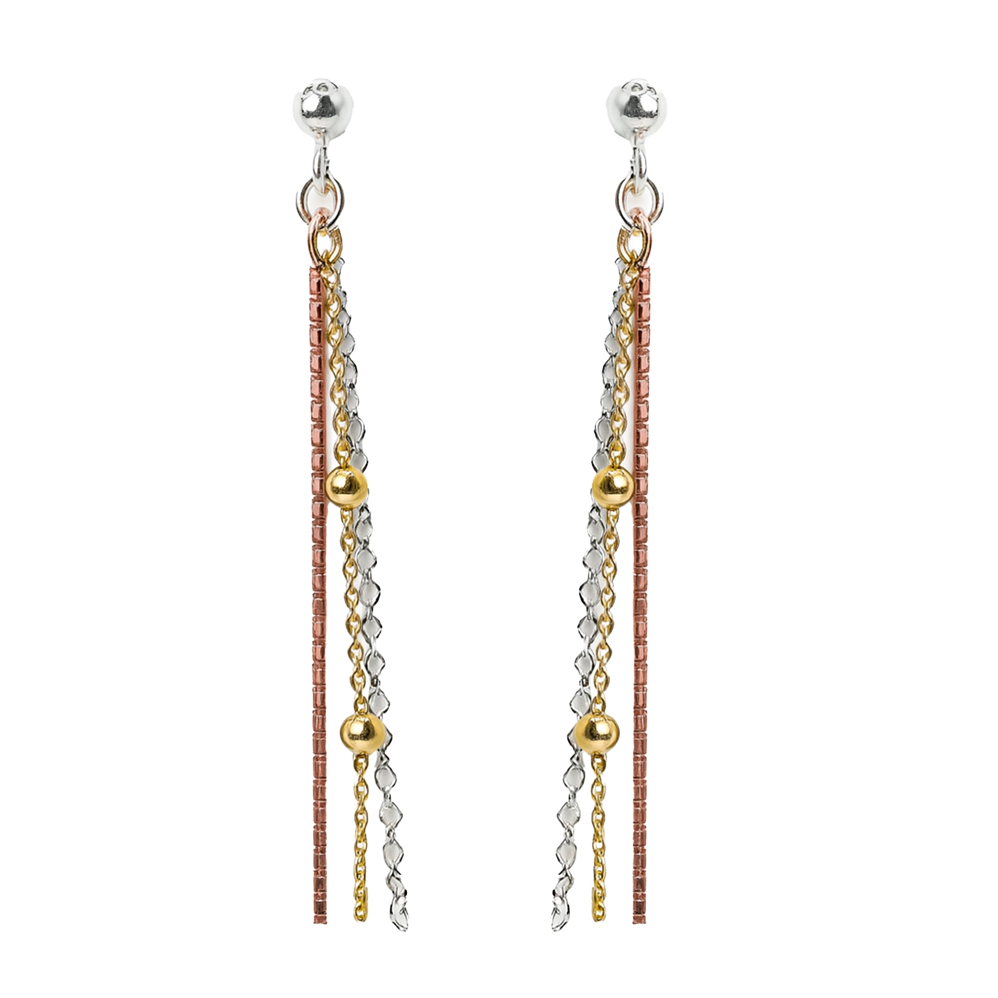 Arete Largo 3 Estilos de Cadena (Cubito, Corazones y Viridiana) Hecho a Mano Plata .925 con Baño de 3 Oros (rosa y dorado)