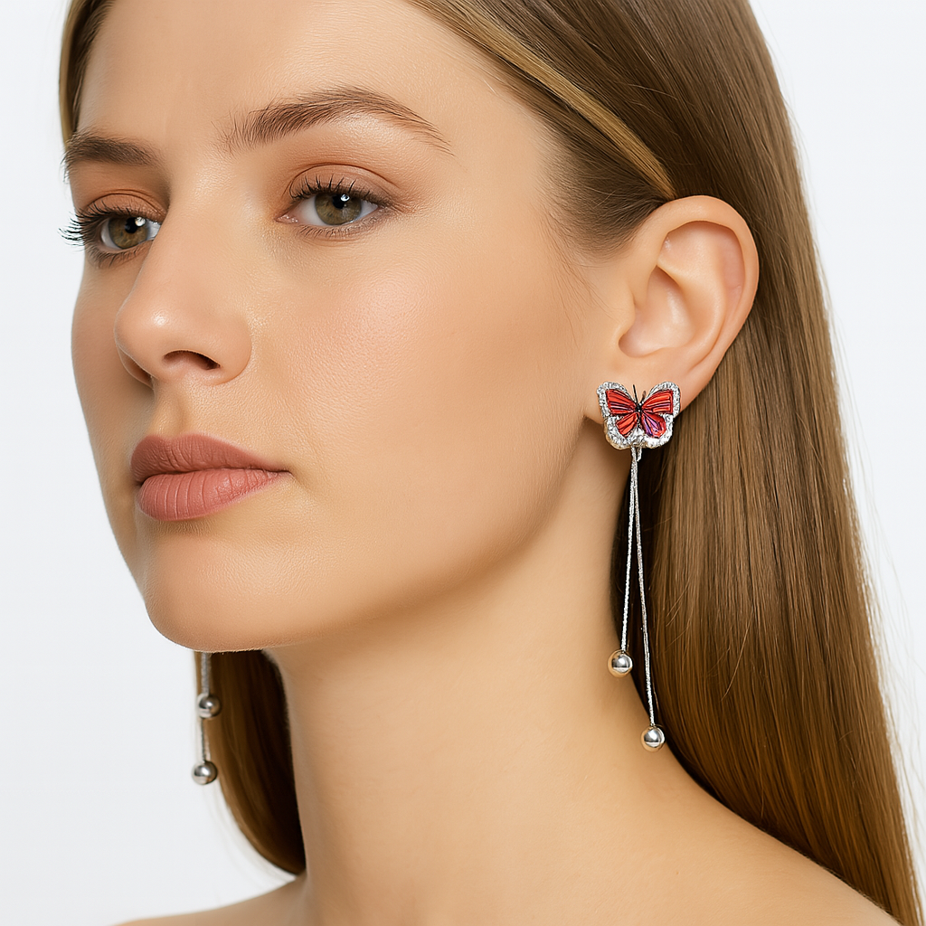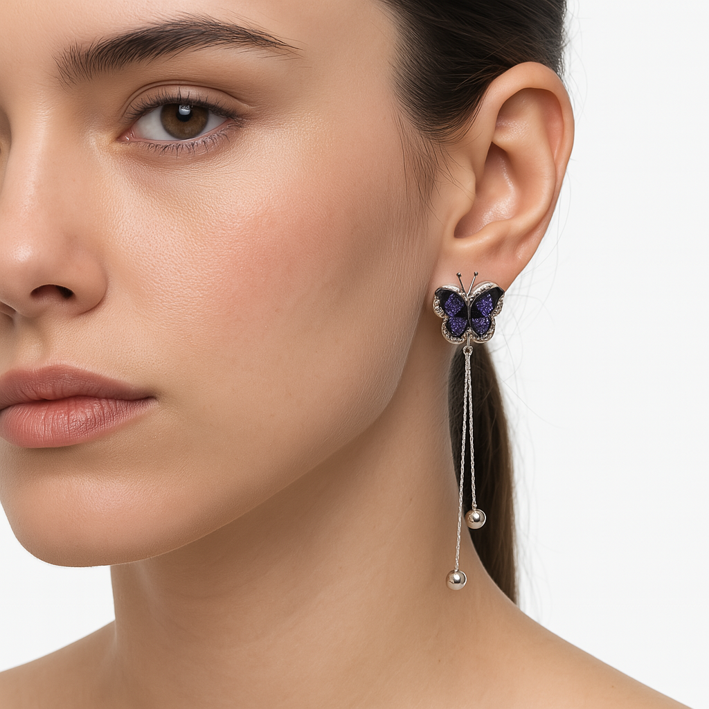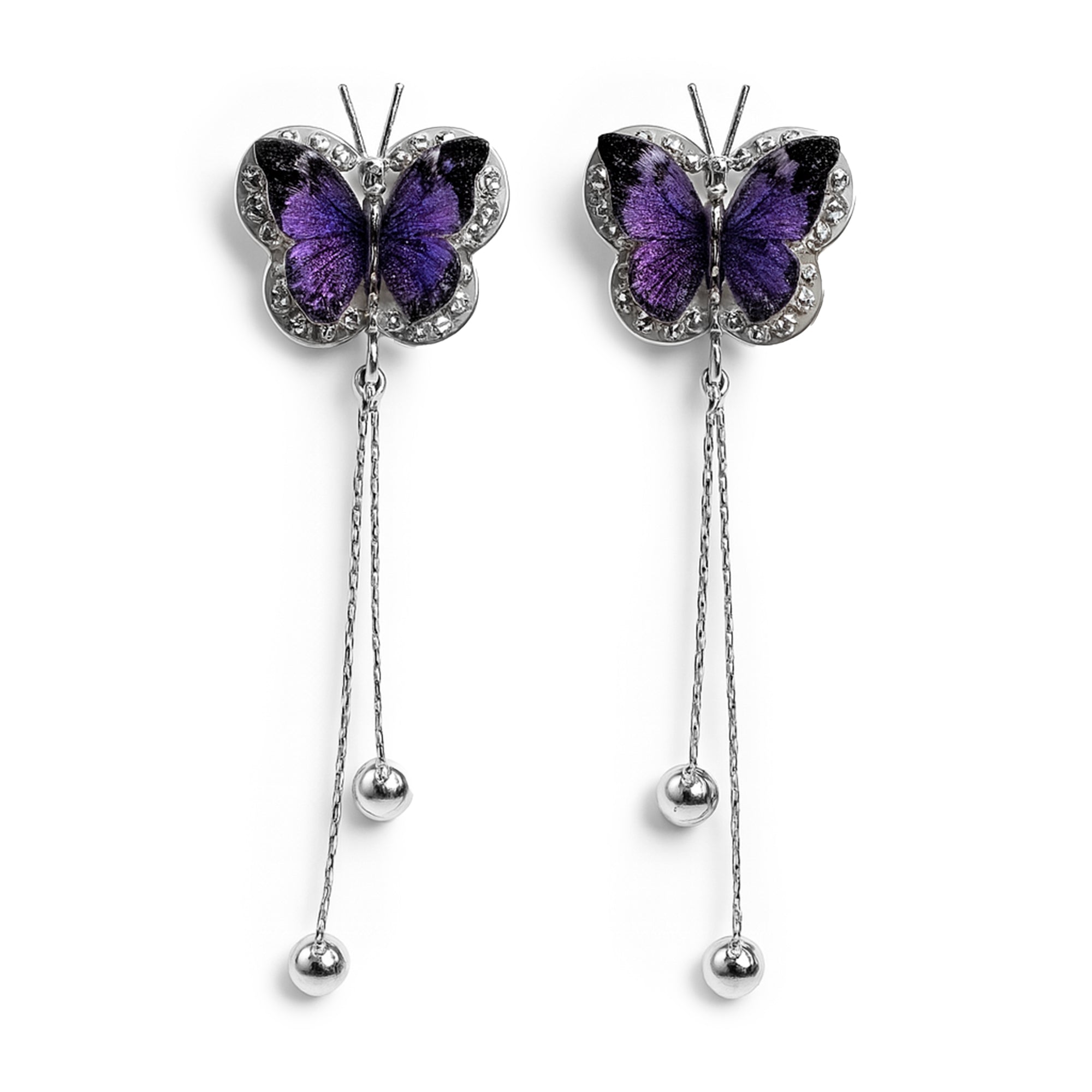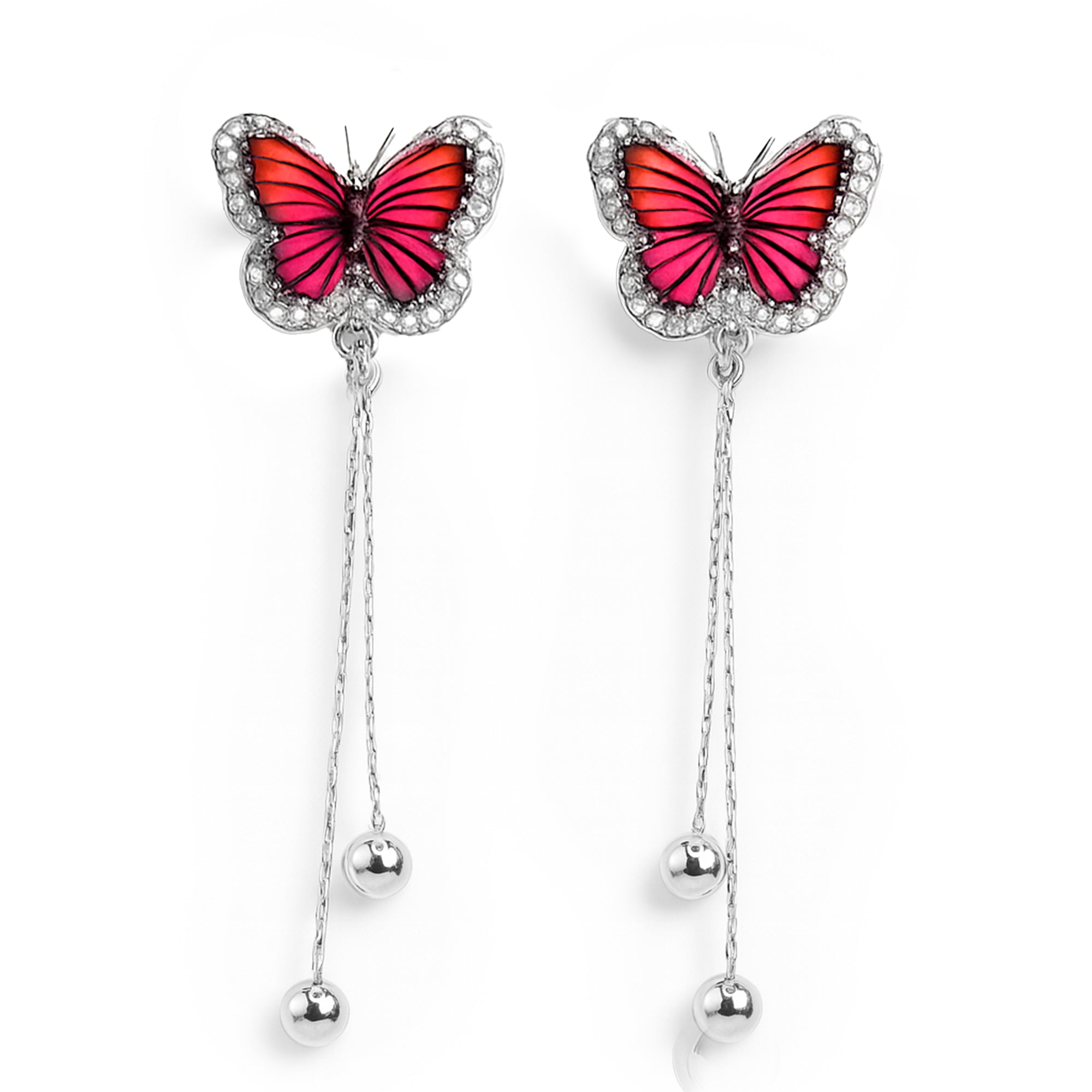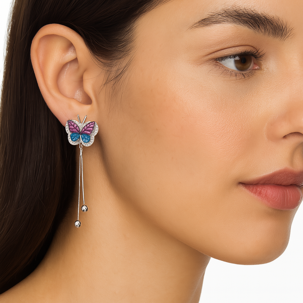 Arete Largo Mariposa con Cristales Bicolor y Cadena Cola de Rata Plata .925