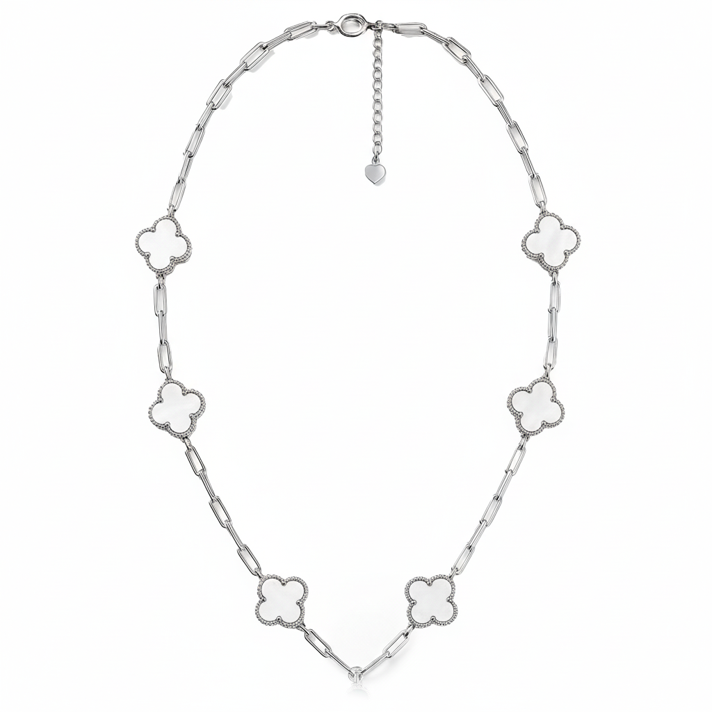 Collar Flores Inspirado Van C Piedras Naturales con Cadena Paper Clip Plata .925 con Rodio mas Extensión Disponible en: Madre Perla y Verde Malaquita