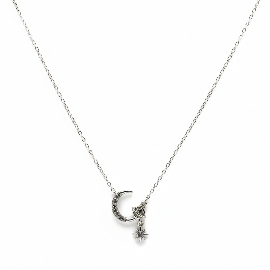 Collar Media Luna con Micro Circonias y Saturno con Estrella Plata .925 con Rodio