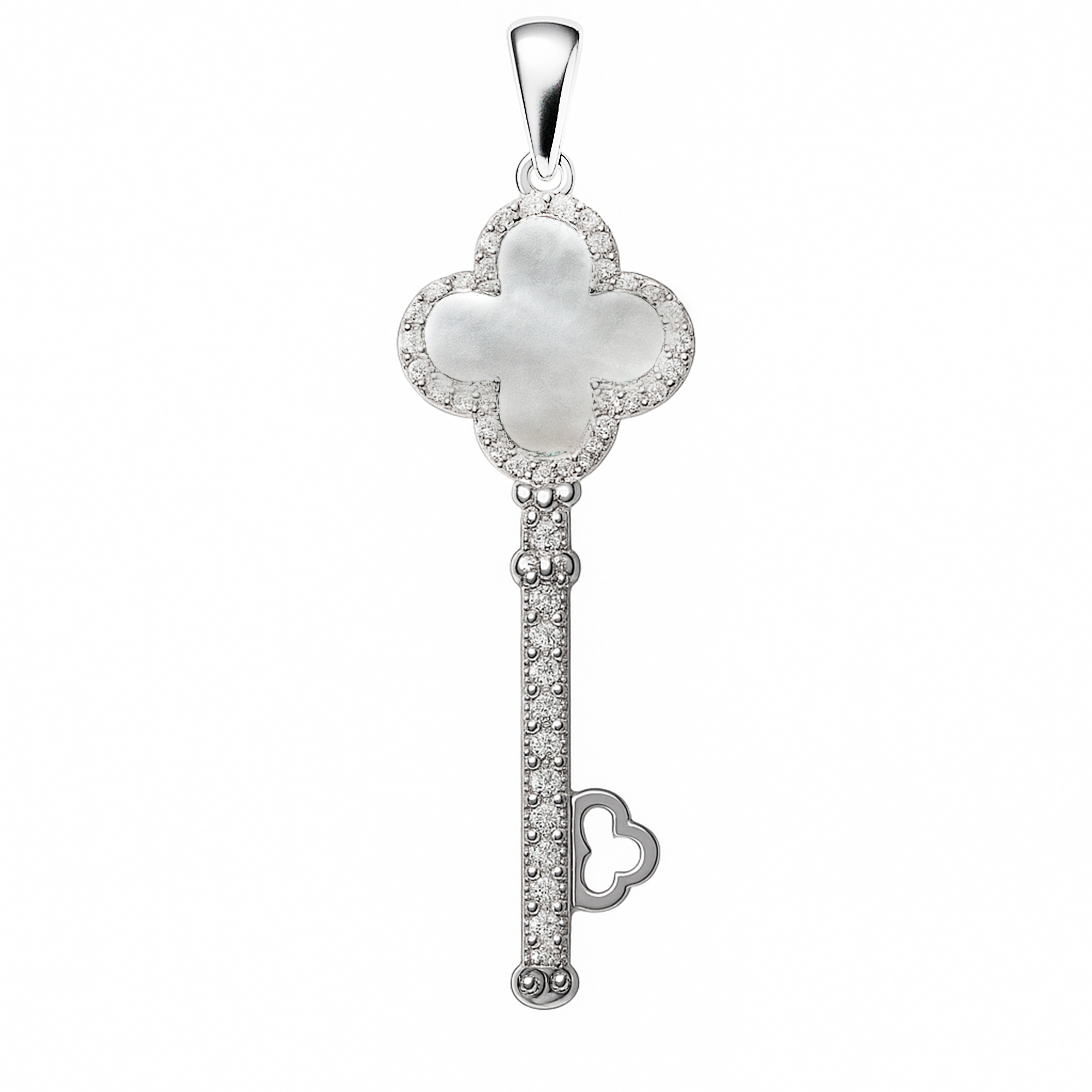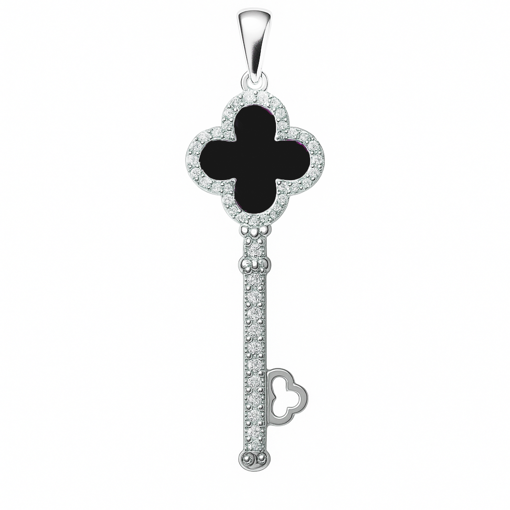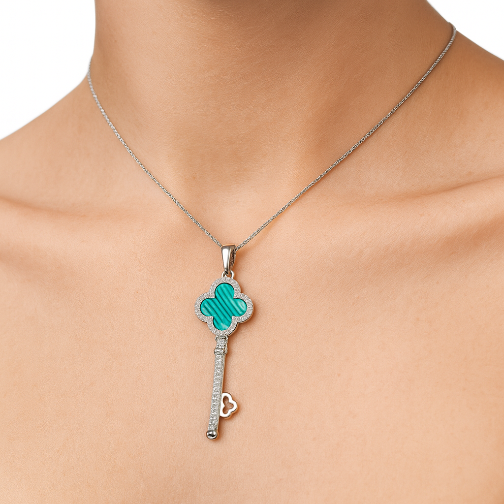 Dije Inspirado Van C en Forma de Llave con Piedras Naturales y Micro Circonias Plata .925 con Rodio Disponible en: Verde Malaquita, Negro Ónix, Cornalina y Madre Perla. Tamaño:4.7 cm