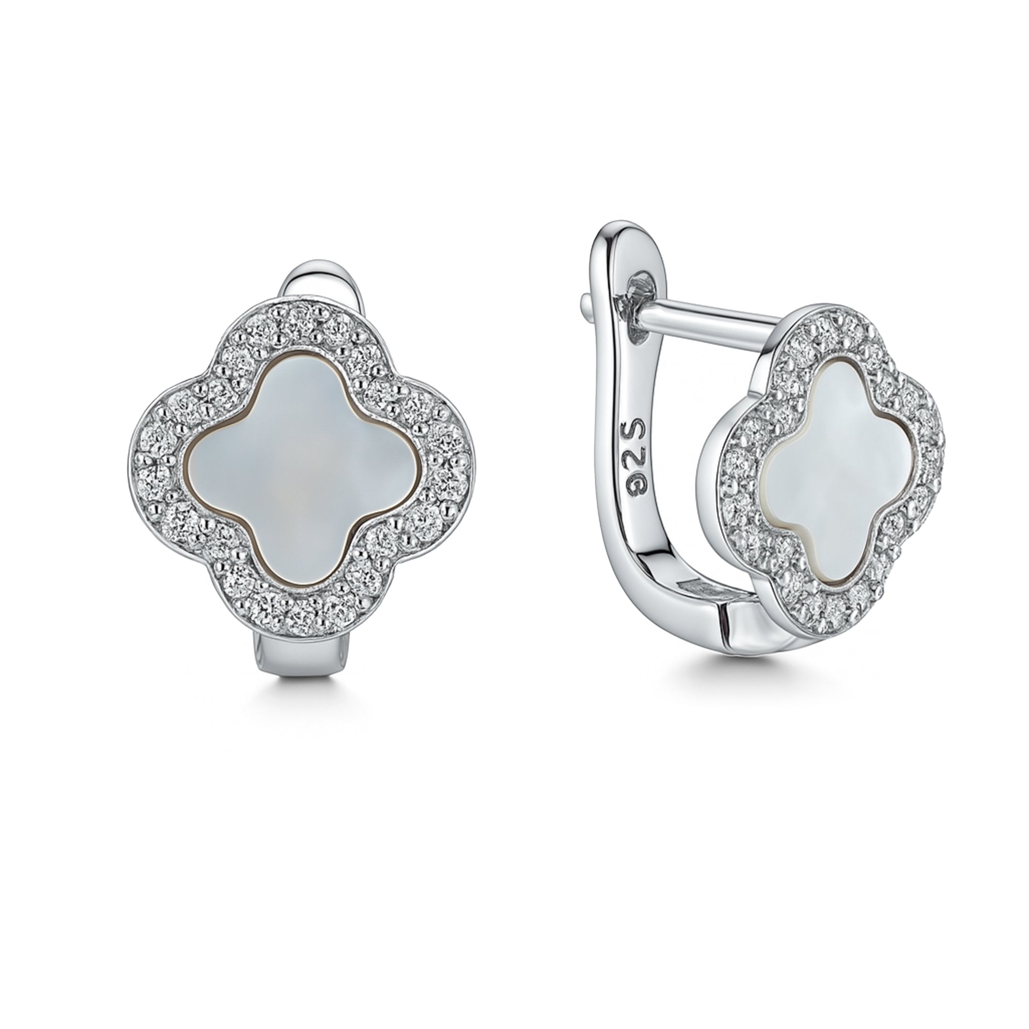 Huggies Flor Inspirado Van C Madre Perla con Micro Circonias Plata .925 con Rodio