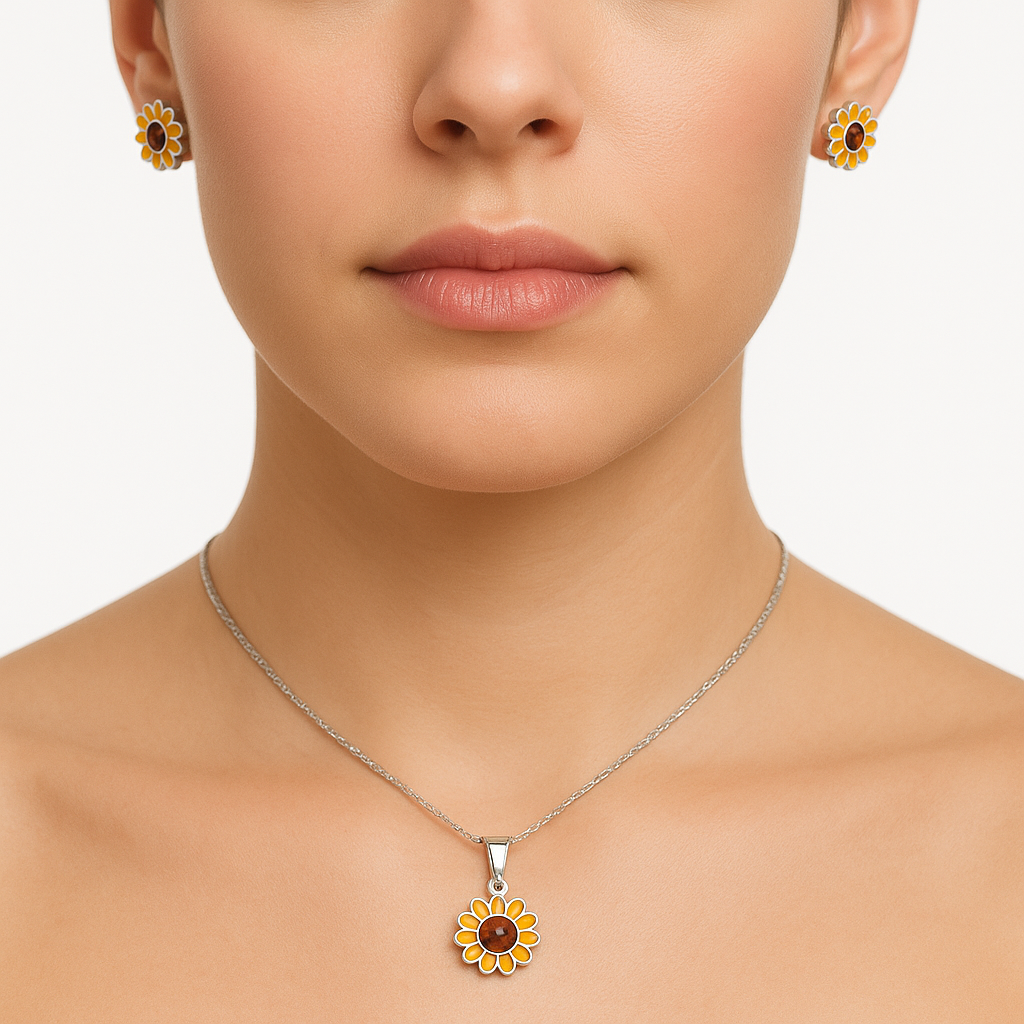 Juego Económico Arete, Dije Girasol con Esmalte y Cristales Plata .925