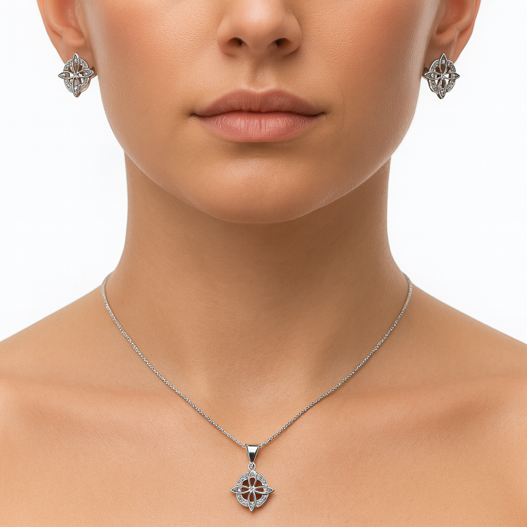 Juego Arete, Dije Nudo de Bruja con Circonias Plata .925