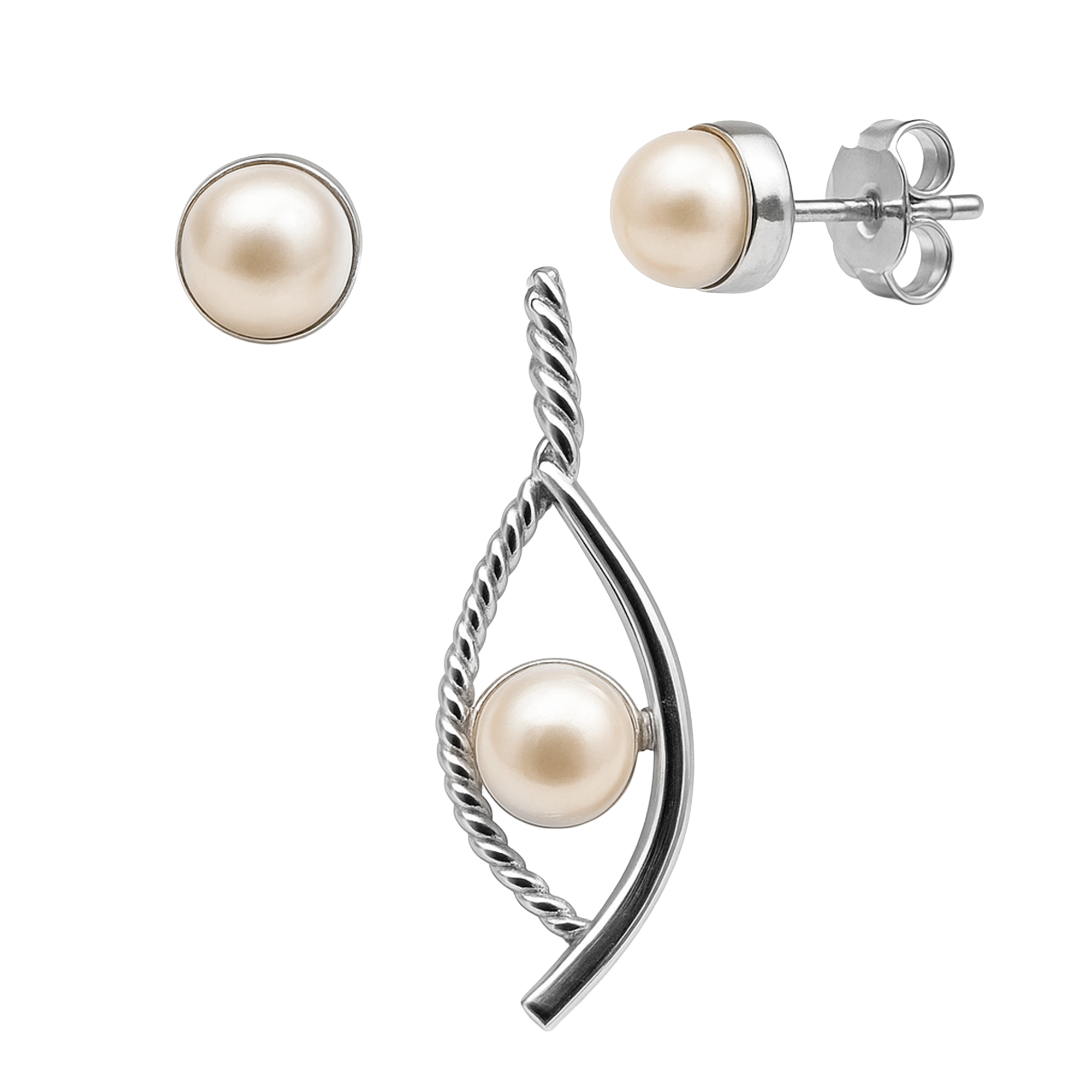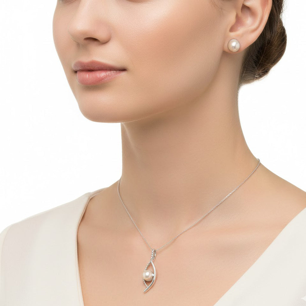 Juego Arete, Dije Perla Natural con Bisel y Nudo Plata .925